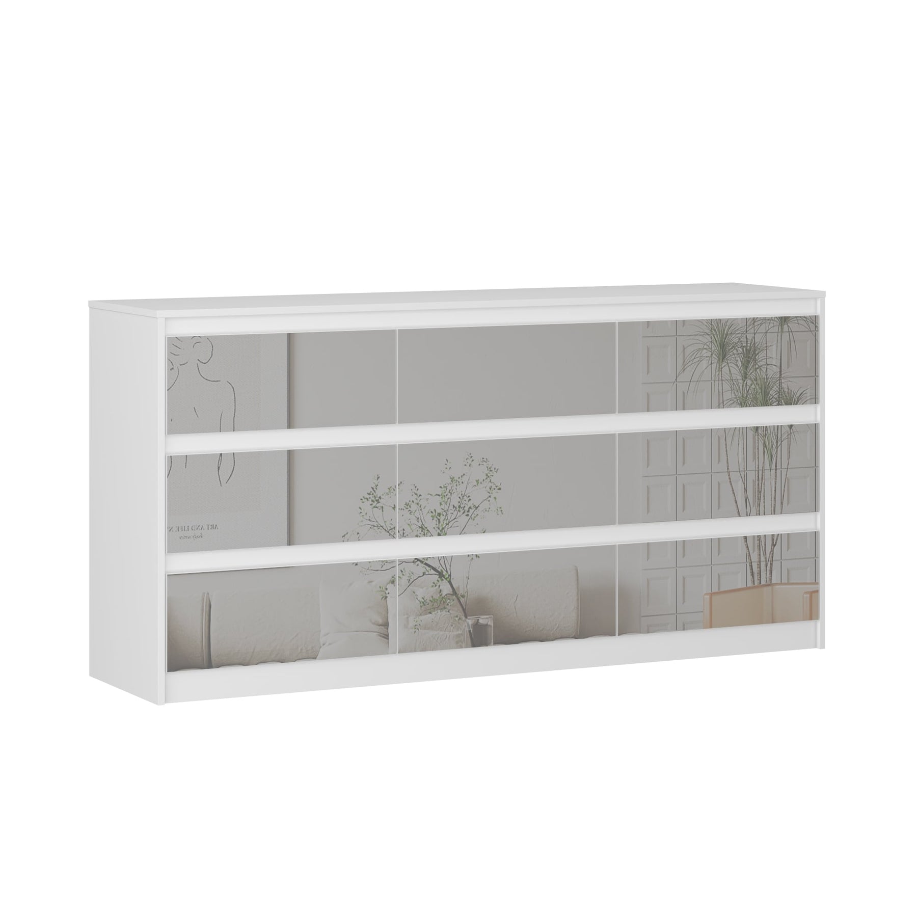 Streamline your storage and give your living space a modern and cohesive look with the Timechee 63'W 9 Drawer Dresser Accent Dresser. Its sleek design and spacious nine drawers provide ample room to organize everything from delicates to bulky clothing items. Each drawer is equipped with metal glides and built-in safety stops for easy and smooth movement, while the handle-free design and extra high drawer sides ensure functionality and spaciousness. Made from engineered wood, this dresser is easy to clean and resistant to water, scratches, and stains, making it perfect for busy families or college living.