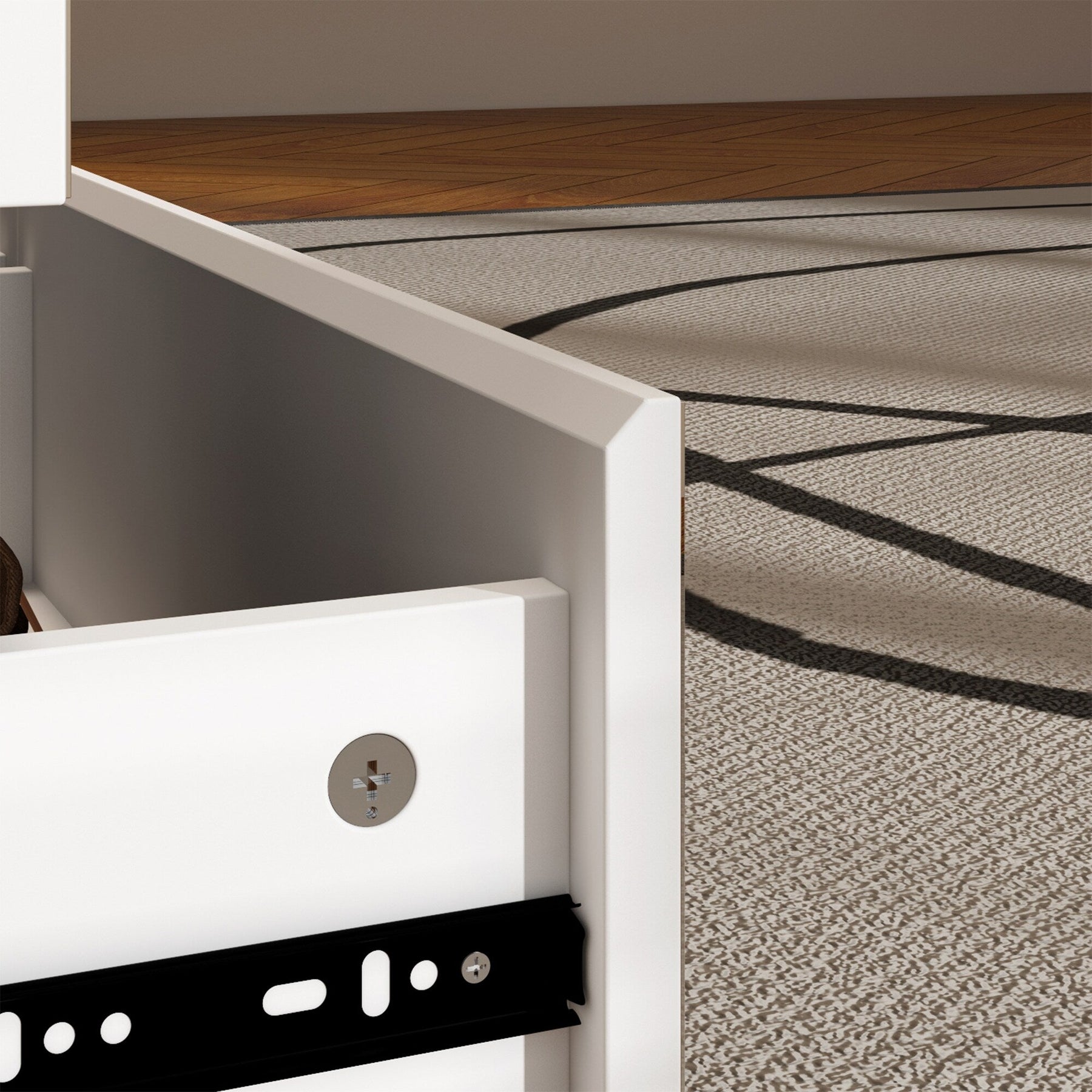 - Drawers retract smoothly on metal glides with built-in safety stops