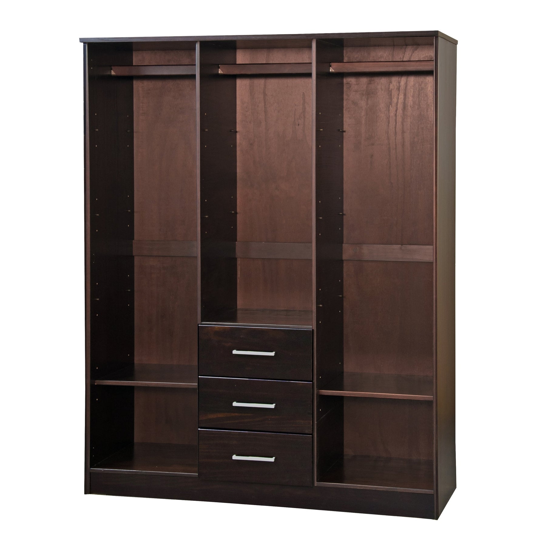 This 100% Solid Wood 3-door Cosmo Wardrobe Armoire will solve all of your storage needs. At 56 inches in width, it offers a large volume for all kinds of items! It comes with 2 shelves, but to compartmentalize it further, optional shelves can be purchased for a total of 10. Whether you keep your possessions tidy or not, they will be hidden behind beautiful solid wood raised panel doors with or without a mirror on soft-closing Euro hinges. If modern looks, straight lines, and aesthetic simplicity accentuated by metal hardware appeal to you, look no further and get this Made in Brazil beauty today! 2-door and 4-door versions are available as well.