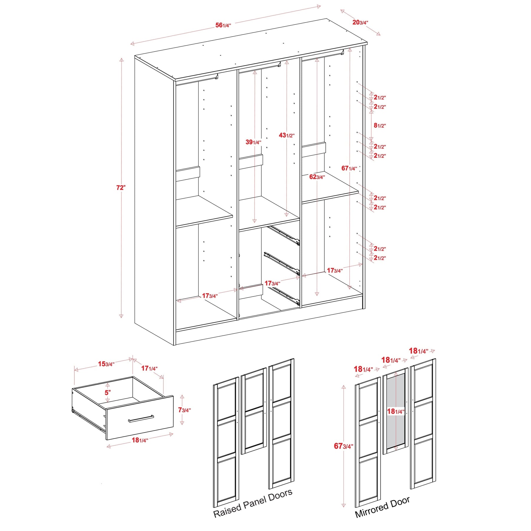- Choice of a mirrored or a raised panel middle door