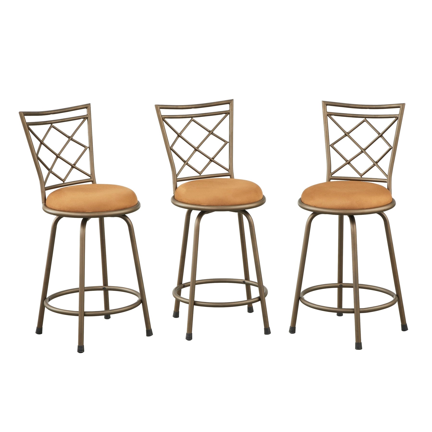 Wonderfully chic and perfectly pretty, these swivel stools are a fun and fabulous addition to your decor. The stools are adjustable and showcase a 360 degree swivel function to allow you to sit and move around with ease. Scintillating finishes in a cross back design is paired with easy-clean microfiber or vegan leather for a fun touch of dimension and glamour. Silver frame with black fabric, brown frame with taupe fabric, black frame with light brown fabric or gold frame with black vegan leather.