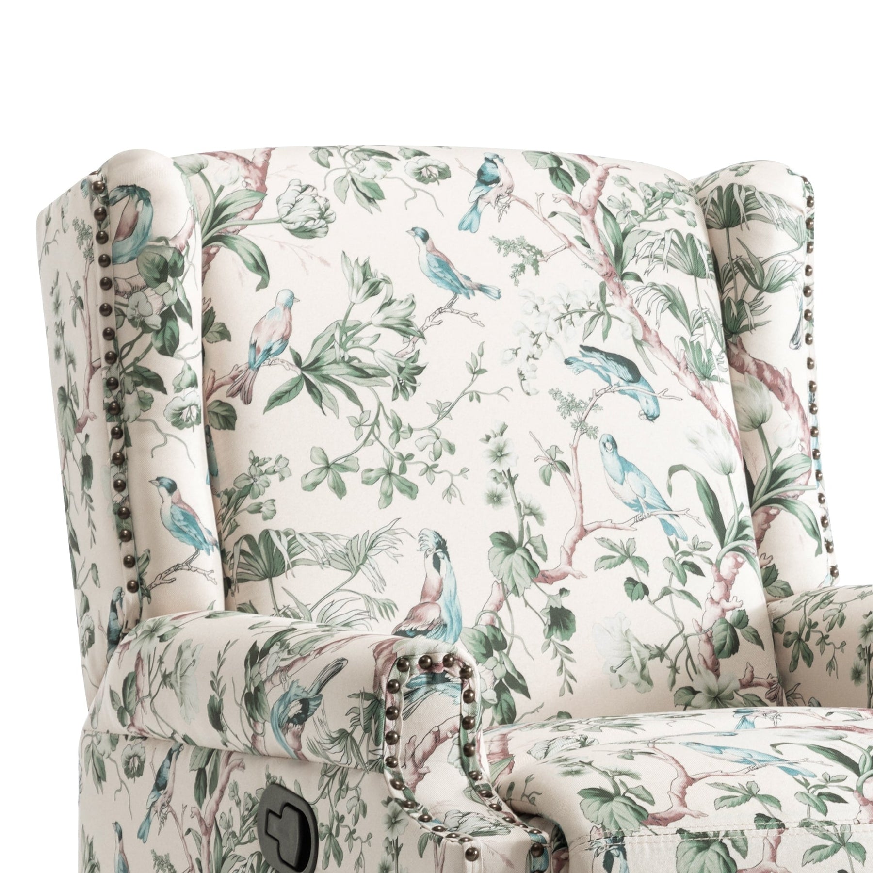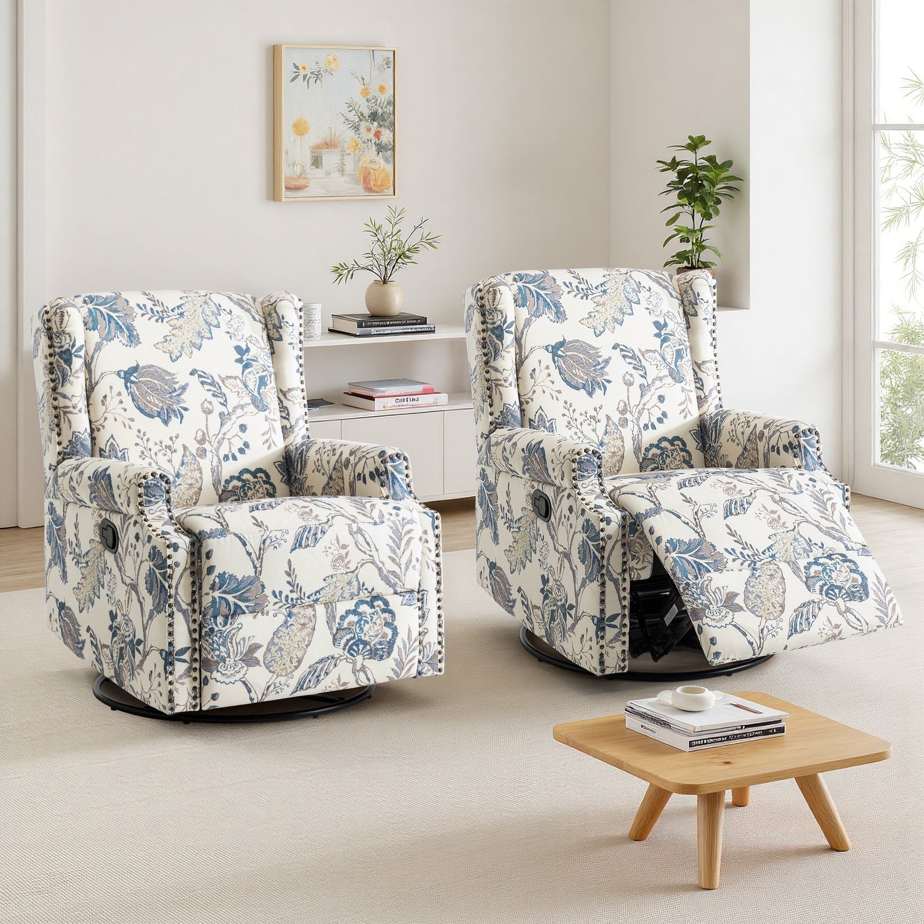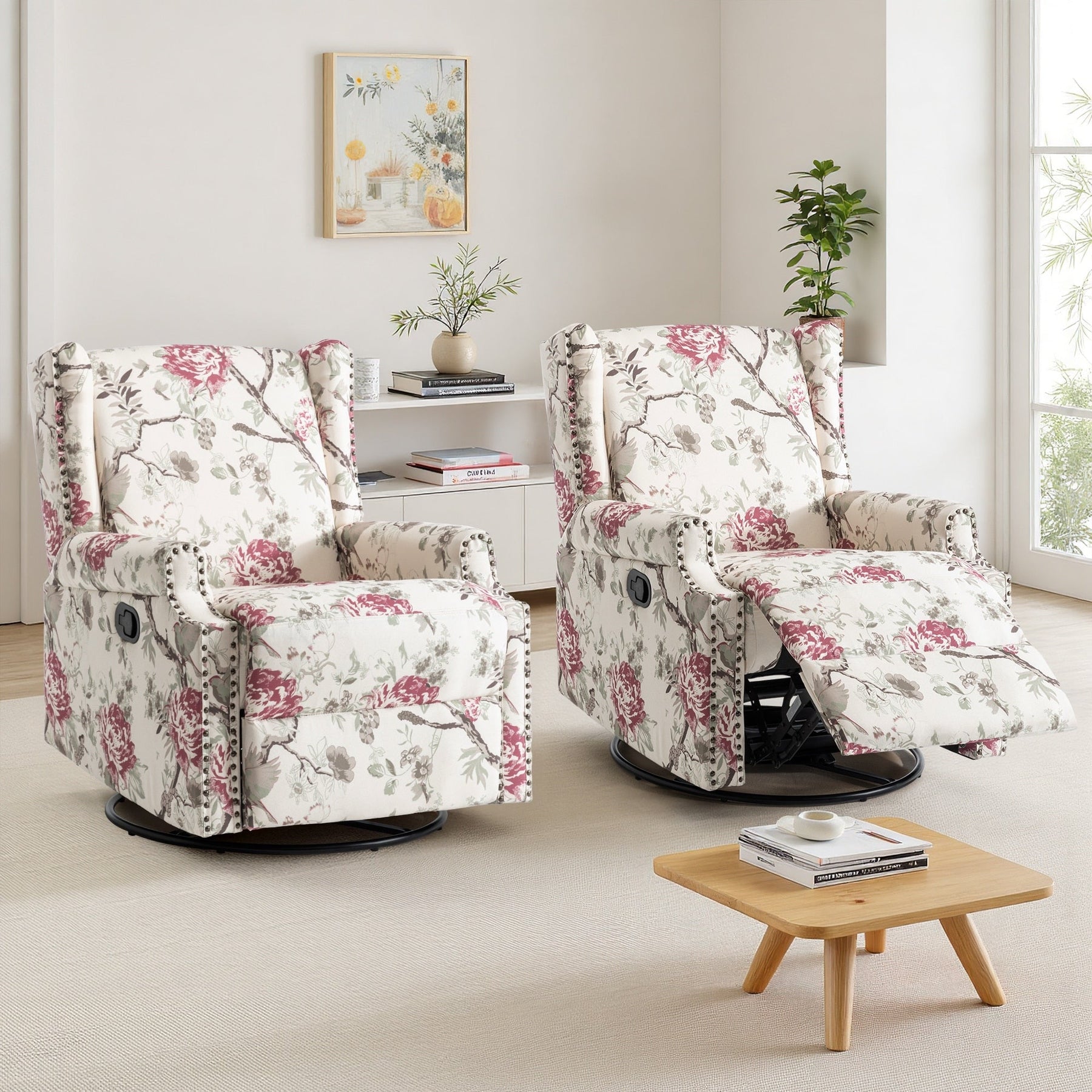 This luxuriously designed swivel recliner offers a perfect blend of ergonomic innovation and timeless elegance. Upholstered in breathable, soft touch cotton linen fabric, it provides lasting durability and an inviting seating experience. The artistic floral and botanical design lends a sophisticated charm, making it a stunning complement to contemporary and classic interiors alike. Engineered for effortless reclining, the adjustable backrest transitions smoothly with a simple side handle mechanism, allowing you to achieve the perfect angle for relaxation. The heavy duty metal swivel base ensures stable, 360 degree rotation, delivering superior mobility. The integrated footrest extends automatically, offering optimal lower body support to enhance comfort. Crafted with precision engineering and high quality materials, this chair is designed to withstand daily use while providing an unparalleled relaxation experience.