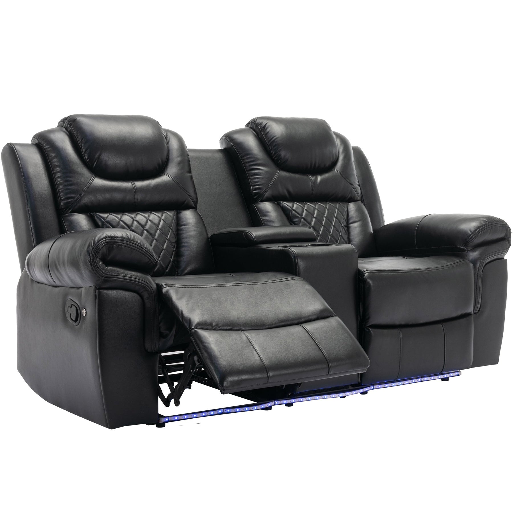 Manual Recliner - Experience the ultimate relaxation with this manual recliner chair. Effortlessly adjust the backrest and footrest to find your perfect reclining position and unwind in comfort.Hidden Storage and 2 Cup Holders - Designed with convenience in mind, this chair features hidden storage compartments to keep your remote controls, magazines, or books within easy reach. It also comes with two cup holders, allowing you to enjoy your favorite beverage while immersing yourself in your favorite movies or shows.Luxury Enjoyment - Crafted with breathable faux leather fabrics, this recliner chair allows for maximum airflow, keeping you cool and comfortable during long movie nights or gaming sessions. Sink into luxury with the soft and comfortable cushioning of this recliner chair. The high-density foam provides exceptional comfort, allowing you to relax and enjoy your favorite entertainment.Sturdy Construction - Designed with a sturdy construction, this recliner chair offers exceptional durability and stability. The metal footrest adds an extra touch of support and comfort, allowing you to kick back and relax.LED Light Strip - Enhance the ambiance of your home theater with the built-in LED light strip. Create a captivating atmosphere and set the mood for a cinematic experience, making every movie night memorable.Enjoy the Perfect TV Show or Movie Night - As you unwind and enjoy your favorite entertainment from the comfort of your own home. Immerse yourself in the world of your favorite characters and lose yourself in captivating storylines, all while indulging in luxurious comfort.