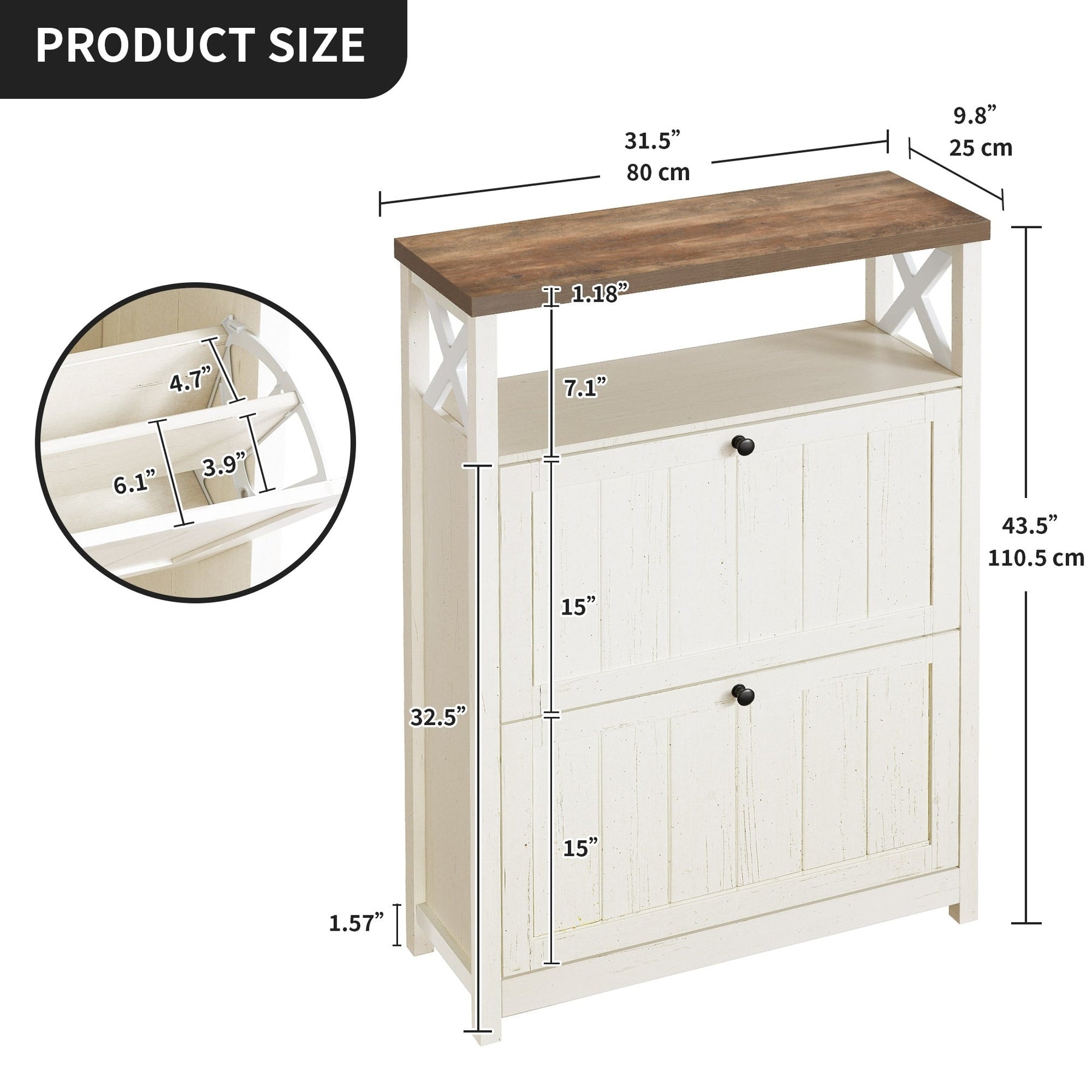 Our slender shoe cabinet, with its warm white finish, is designed to maximize space and keep your entryway clutter-free. It features flip drawers to organize and protect your shoes, an open compartment, and top storage for everyday essentials. The solid design with thickened panel and wooden legs ensures stability and resistance to bending, ideal for heavy weights.