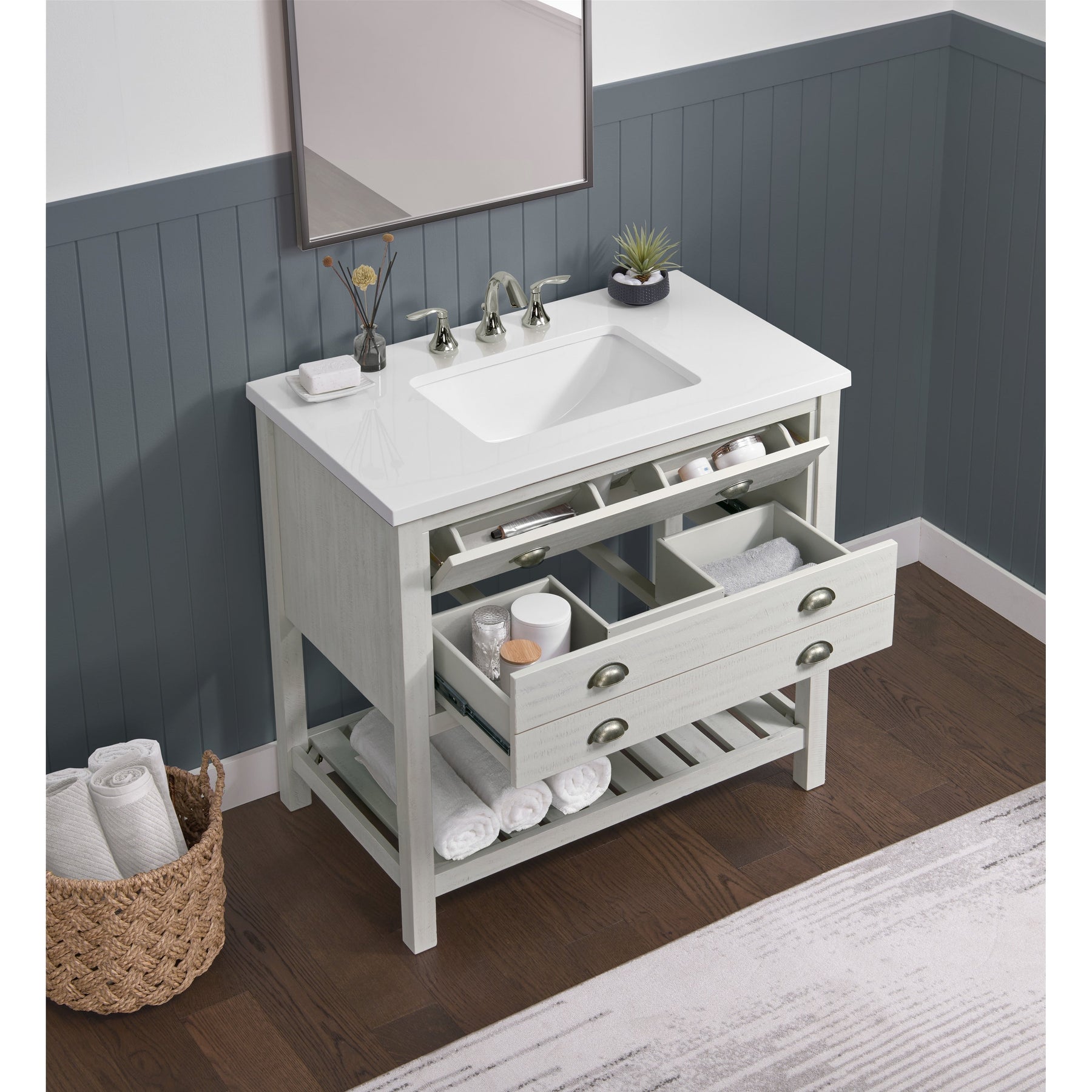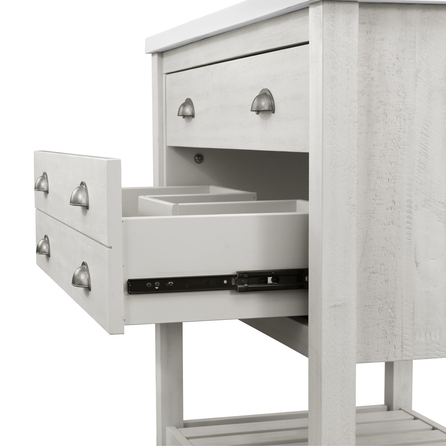 Transform your bathroom into a coastal farmhouse oasis with the Monterey 37' single bathroom vanity. Crafted from durable solid pine wood base, this single sink vanity features a solid white cultured marble top with pre-drilled holes for an 8' faucet (faucet not included). One nicely sized split drawer and a top tilt down drawer offer plenty of storage space for toiletries. A bottom slat shelf provides additional storage space for towels, linens, and other items.