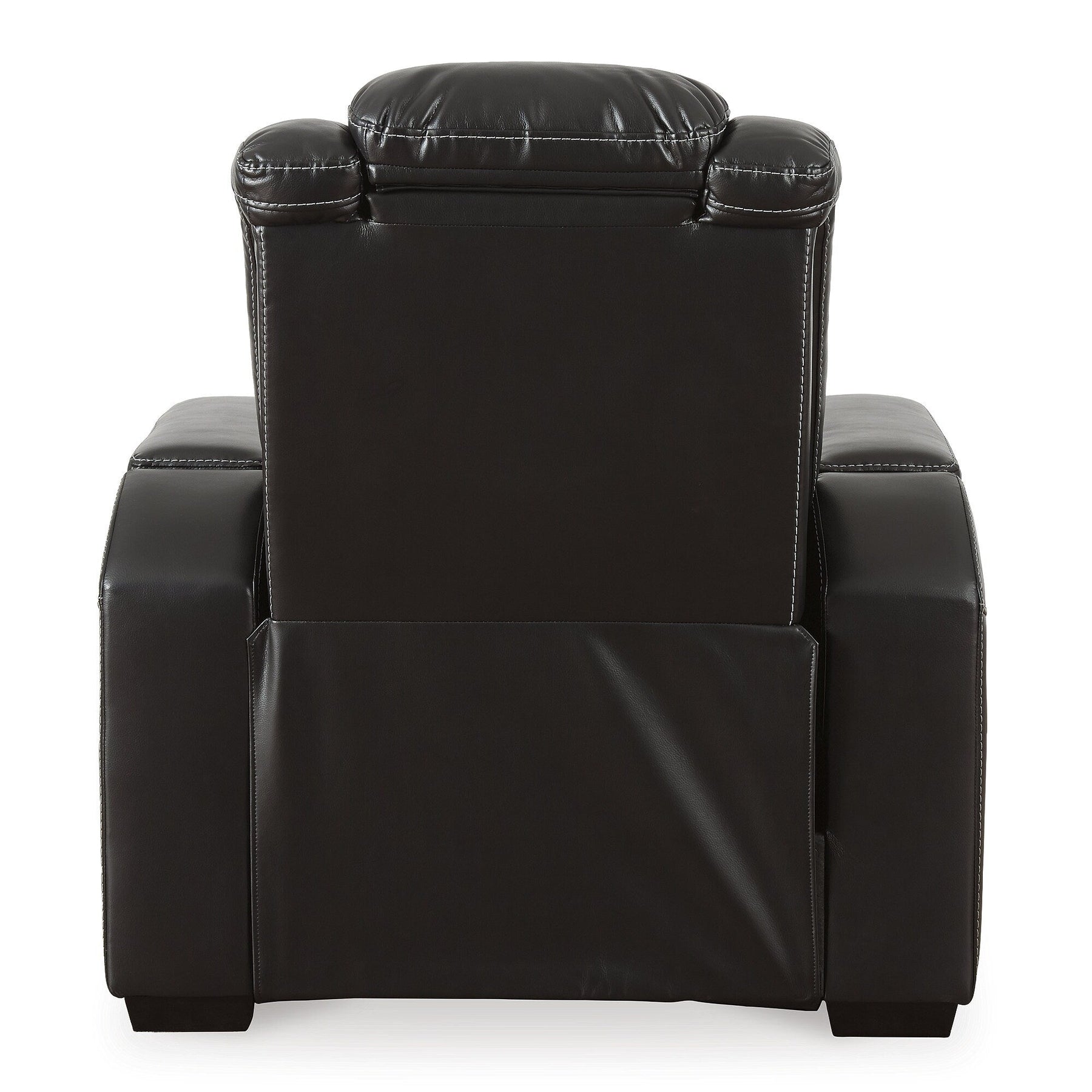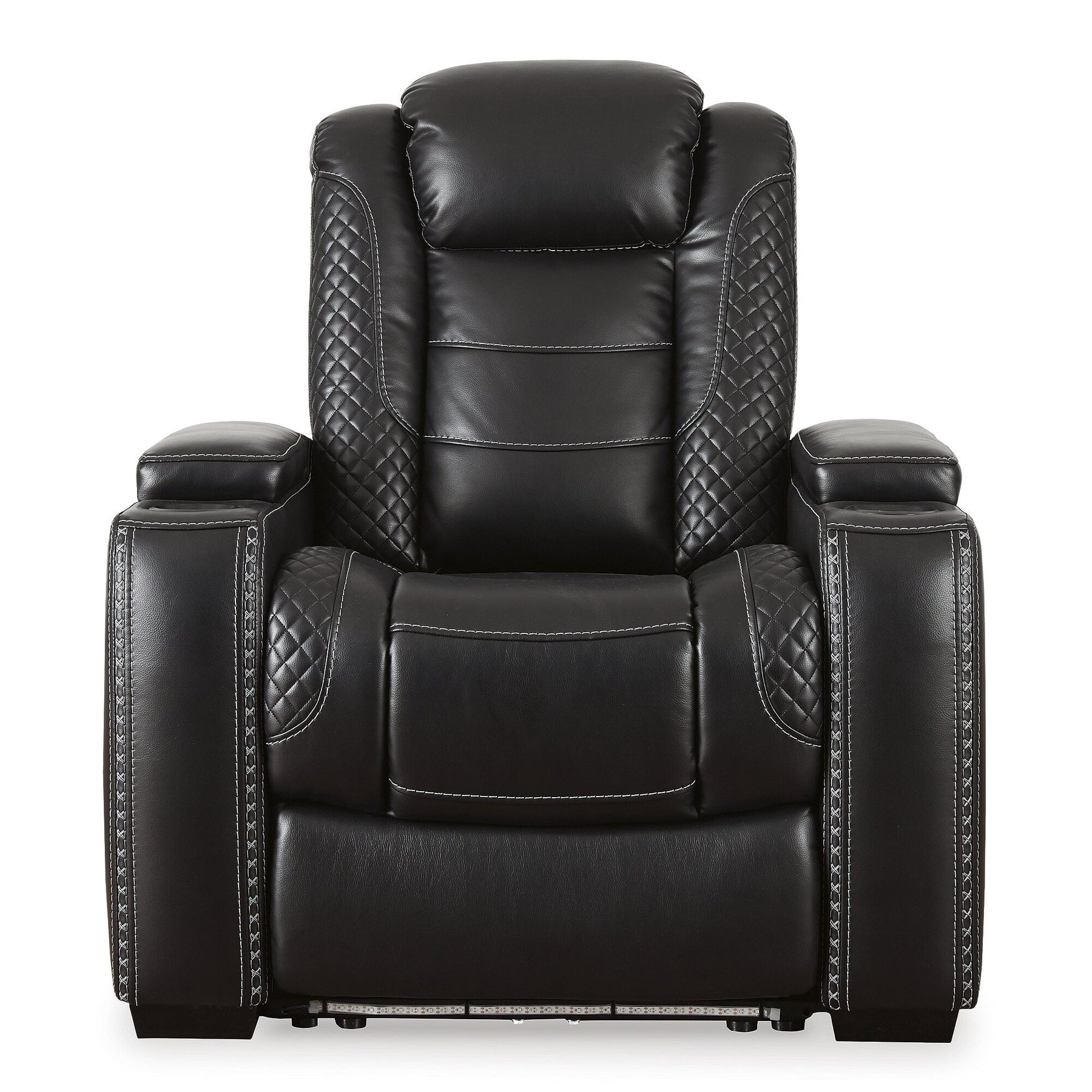 Need a fun, relaxing spot to unwind and watch TV? You'll find that space with the Party Time power recliner with adjustable headrest. In a midnight-colored polyester upholstery with cross hash stitching, lattice accents, and LED lighting, it has a fabulously modern look. When it comes to comfort, you'll love the reclining bucket seat and its adjustable power headrest that delivers a personalized comfortable angle for TV viewing. It's convenient too¡ªsporting lighted cup holders, built-in power button with USB port on control, flip up padded armrest with hidden storage underneath and lower LED lighting. It's certain to become a hit in any home. How could you only get one?
