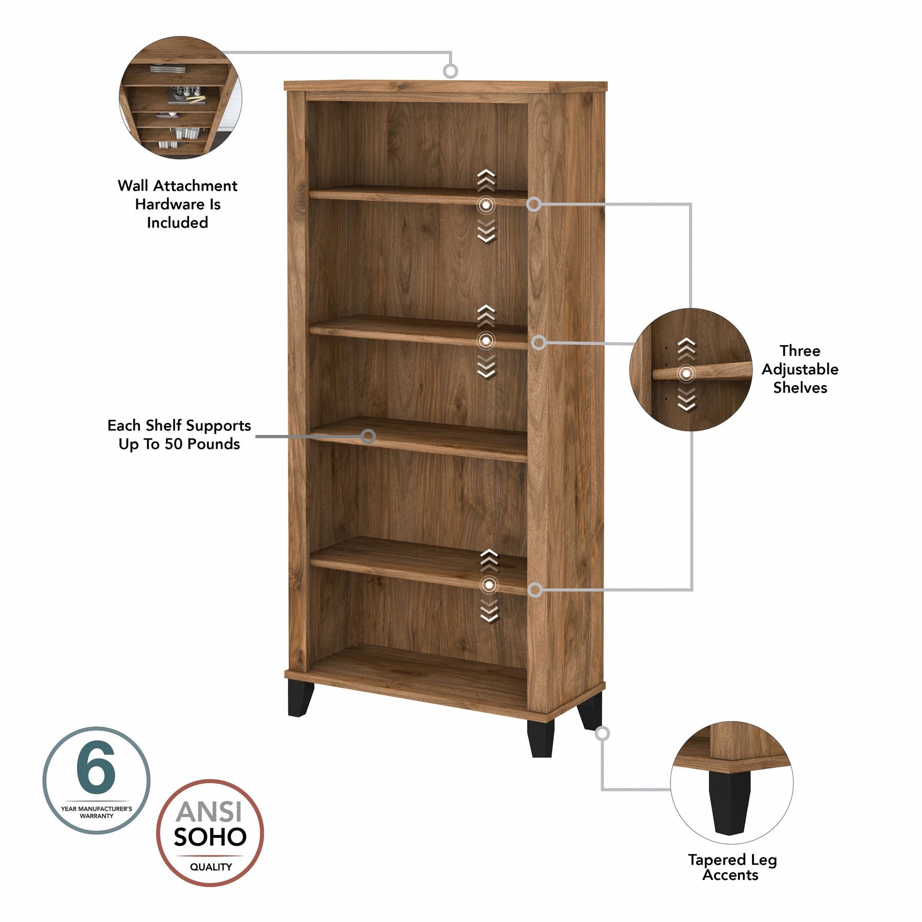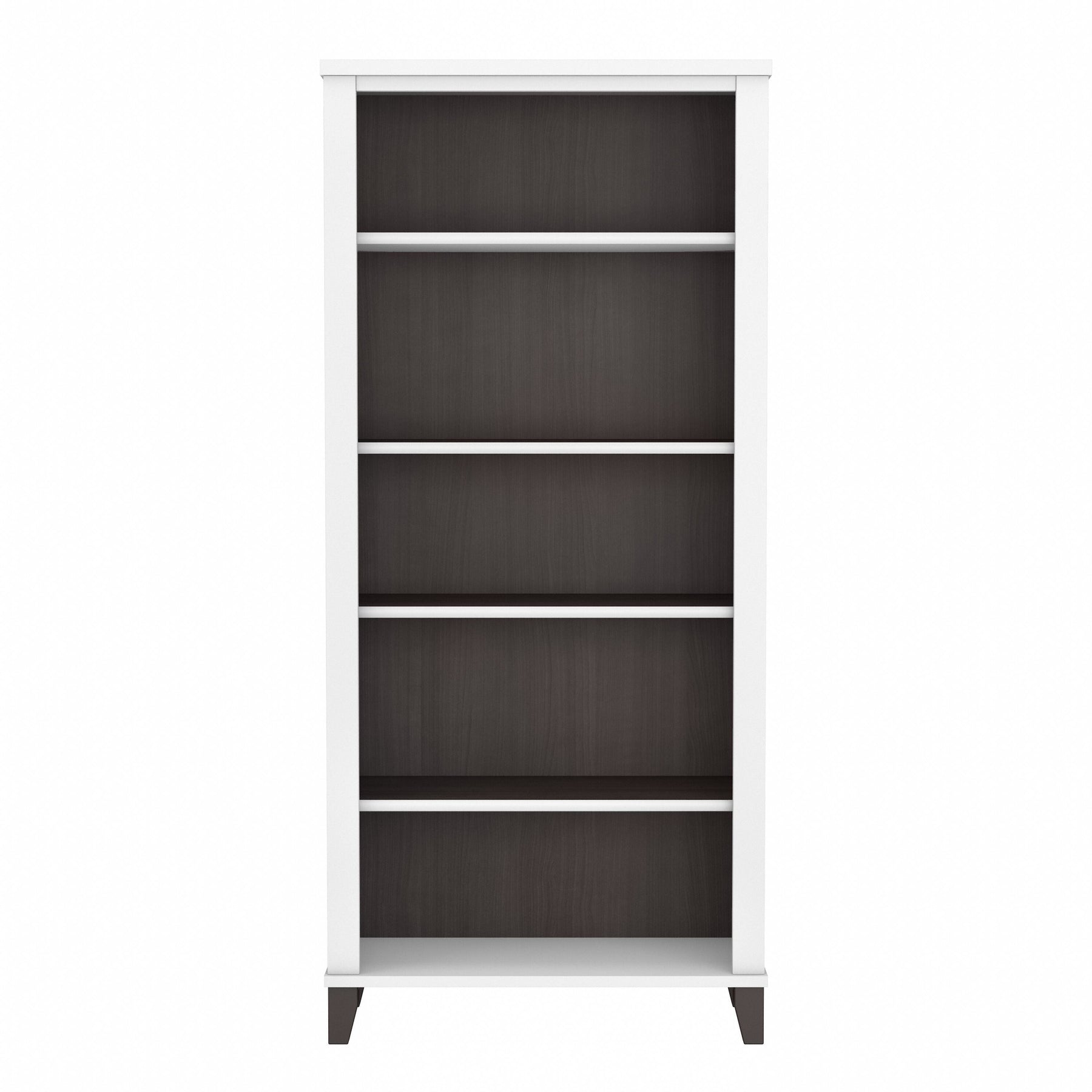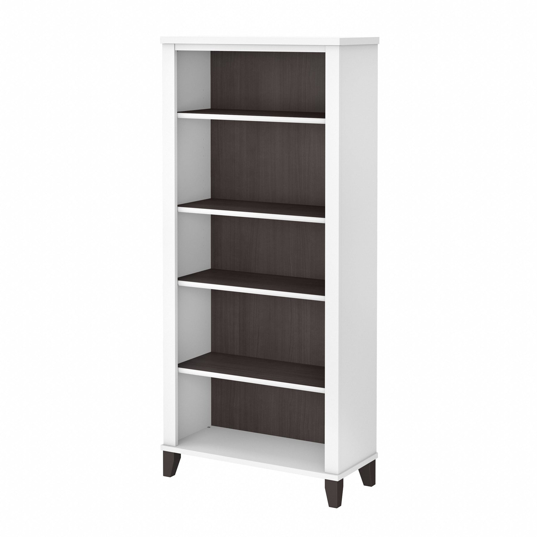 Turn any space into your own personal library with the Bush Furniture Somerset Tall 5 Shelf Bookcase. With a stylish tapered leg design and your choice of several attractive finishes, this tall bookshelf is a perfect way to organize any home office or living room. Two shelves are fixed to provide structural strength, and three are adjustable so your items are sure to fit. The height of the Bookcase matches that of a Somerset Desk and Hutch combination (sold separately) to create a coordinated appearance. Its sturdy construction and durable laminate finish allow you to display books, decorations and more for years to come. Wall attachment hardware is included for family-friendly safety and security. This Tall Bookcase is tested to meet ANSI/SOHO quality standards for safety and performance and is backed by the Bush Furniture 6 Year Manufacturer's Warranty. Add the 5 tier bookshelf to your existing decor or expand your home office with a broad range of coordinating desk and storage options from the Somerset Collection