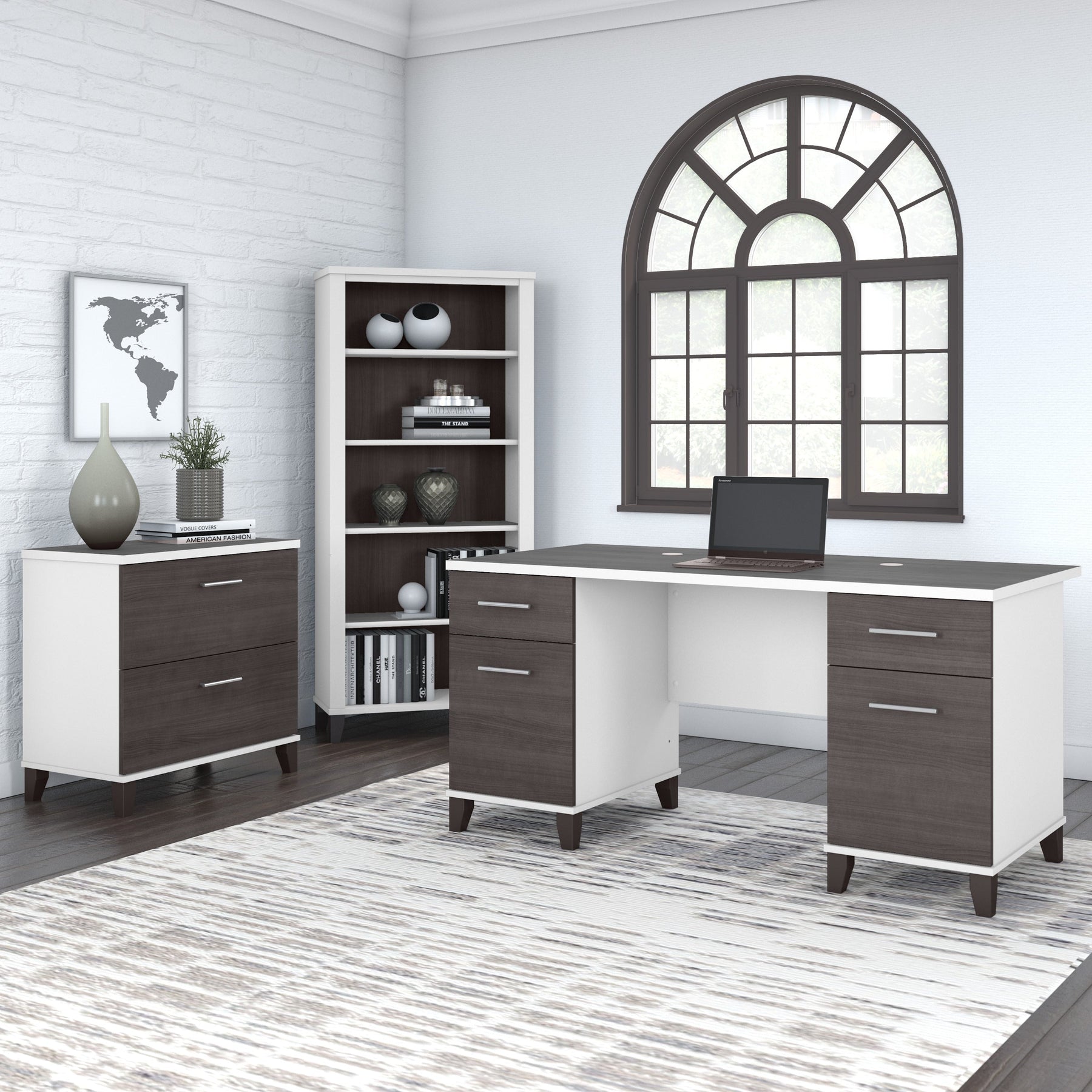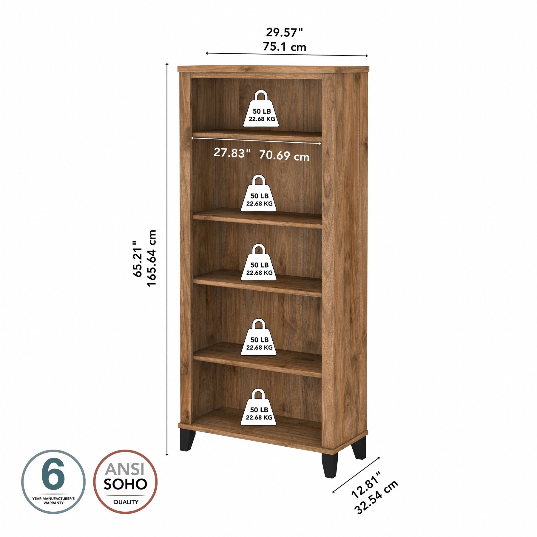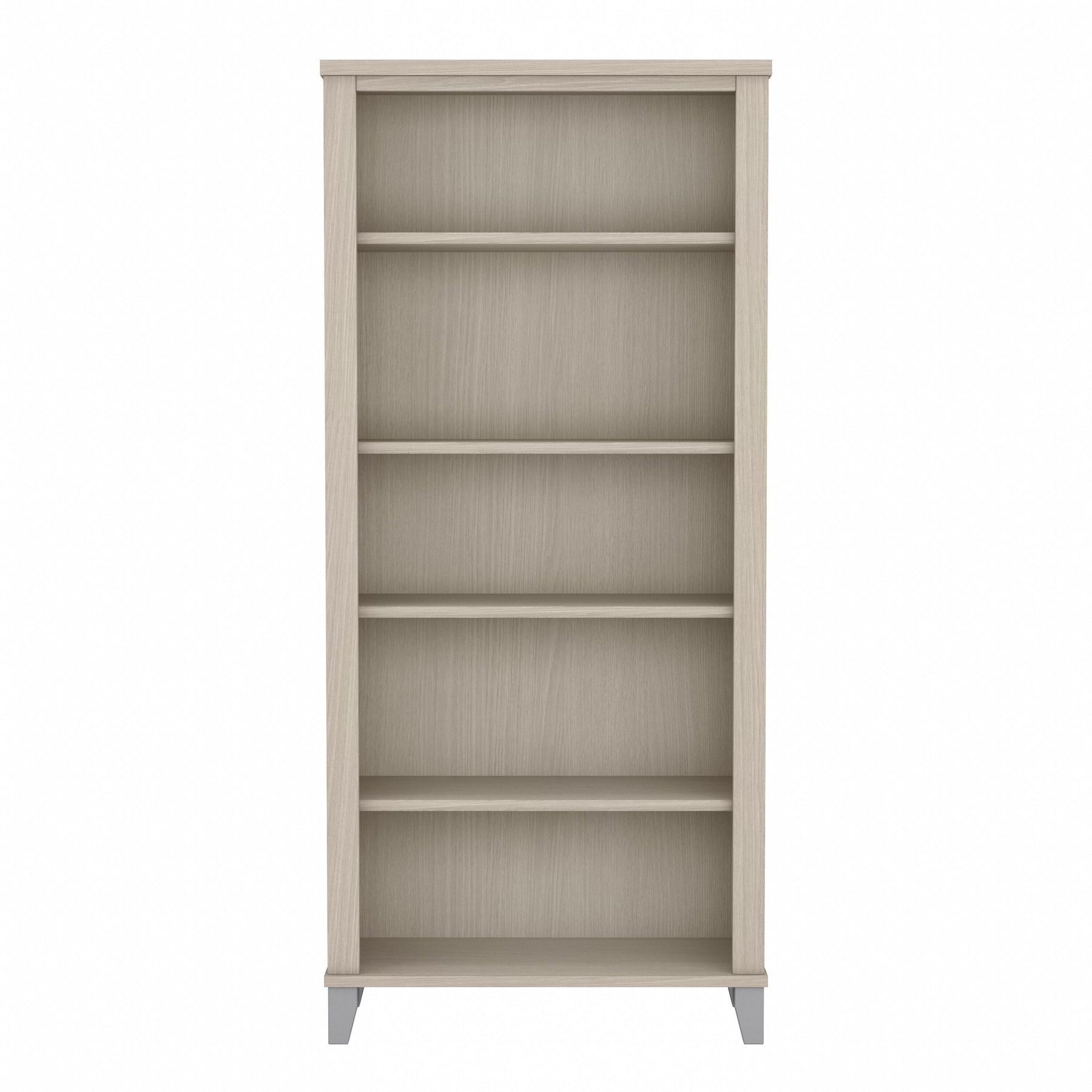 Turn any space into your own personal library with the Bush Furniture Somerset Tall 5 Shelf Bookcase. With a stylish tapered leg design and your choice of several attractive finishes, this tall bookshelf is a perfect way to organize any home office or living room. Two shelves are fixed to provide structural strength, and three are adjustable so your items are sure to fit. The height of the Bookcase matches that of a Somerset Desk and Hutch combination (sold separately) to create a coordinated appearance. Its sturdy construction and durable laminate finish allow you to display books, decorations and more for years to come. Wall attachment hardware is included for family-friendly safety and security. This Tall Bookcase is tested to meet ANSI/SOHO quality standards for safety and performance and is backed by the Bush Furniture 6 Year Manufacturer's Warranty. Add the 5 tier bookshelf to your existing decor or expand your home office with a broad range of coordinating desk and storage options from the Somerset Collection