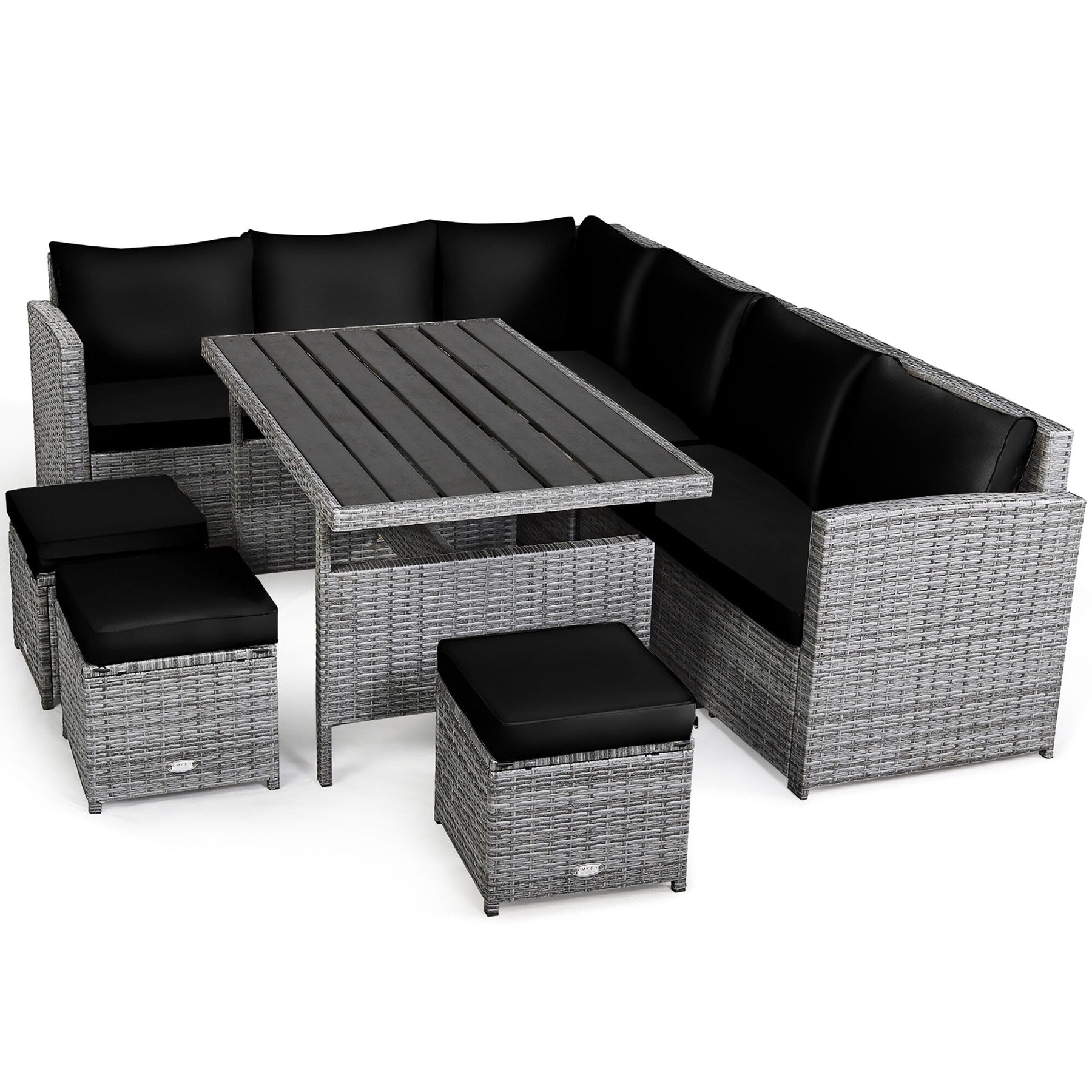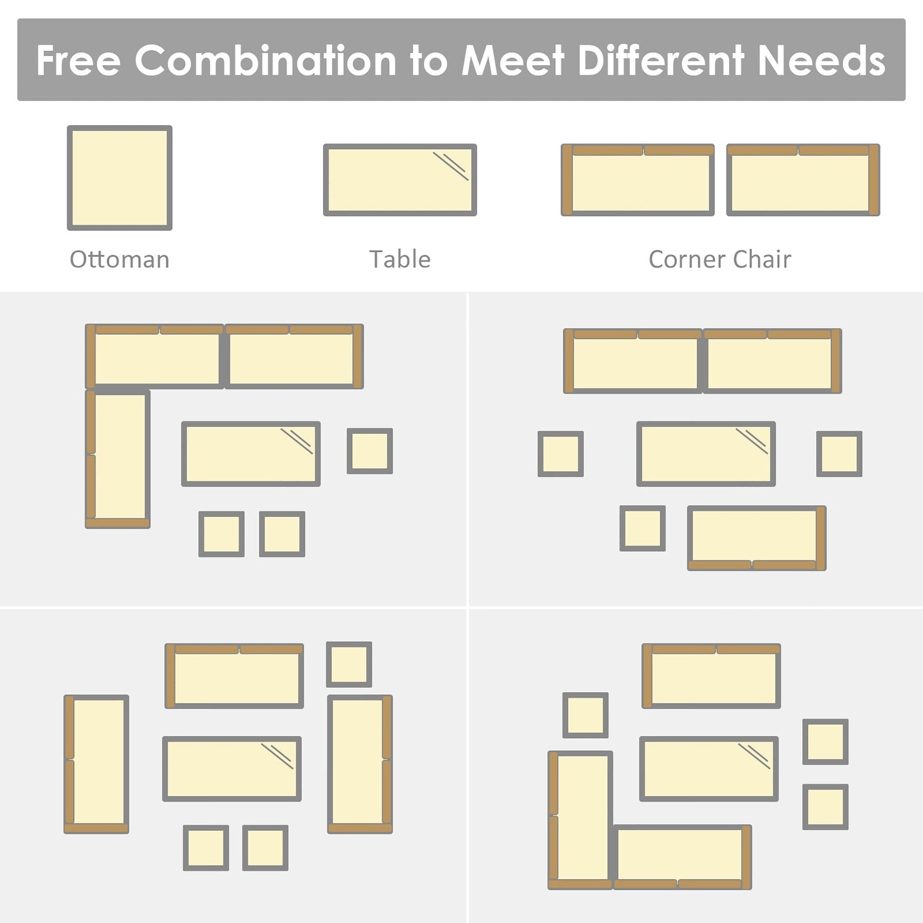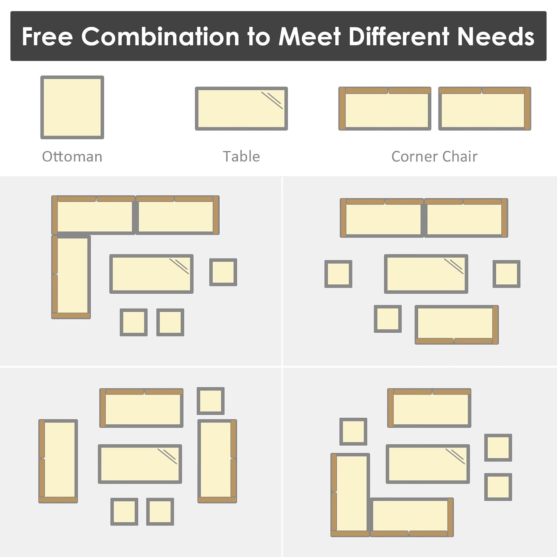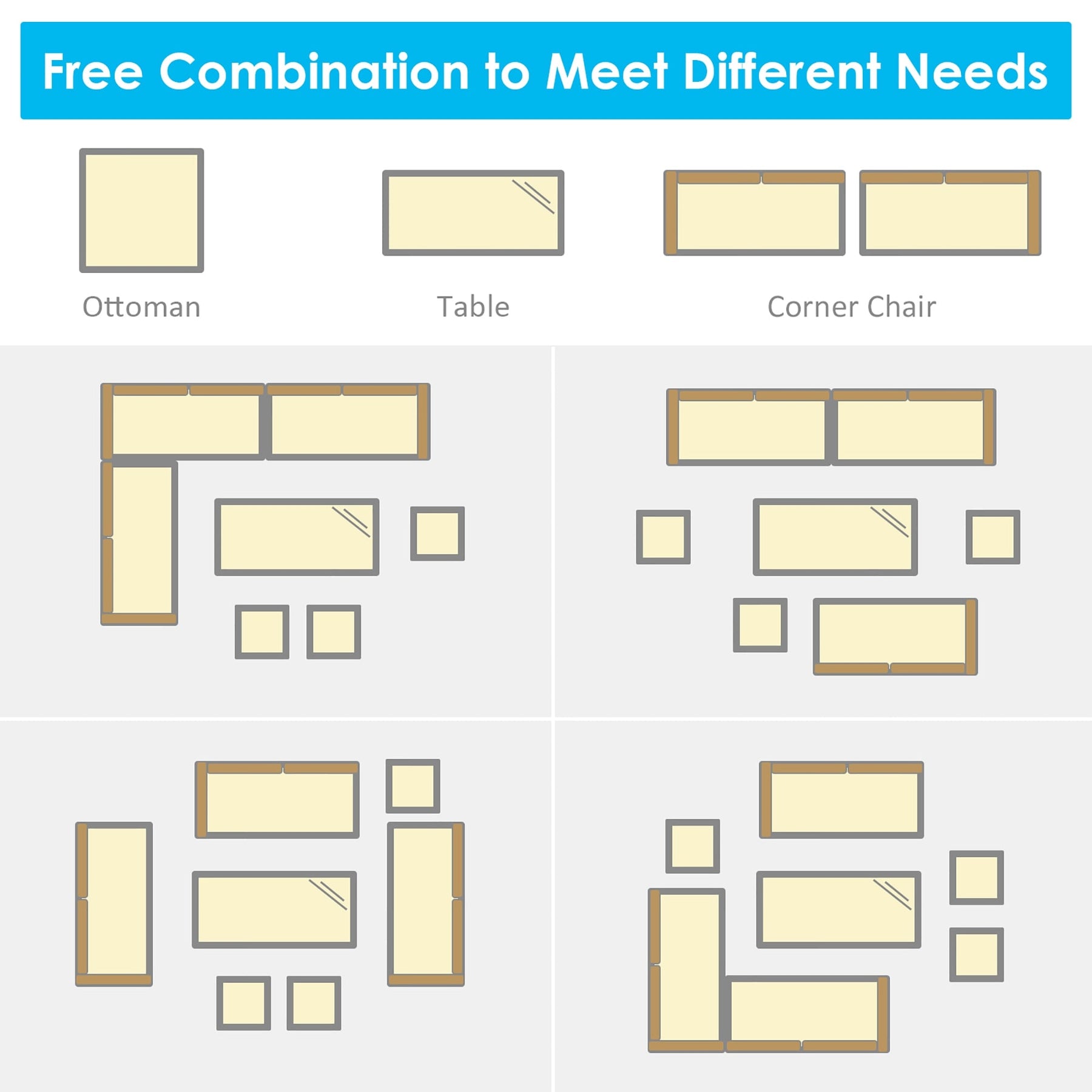 Includes 3 corner chairs, 1 table and 3 ottomans for versatile use
