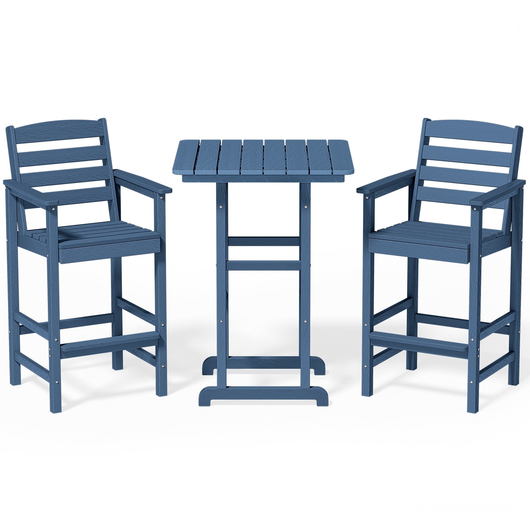 The set includes a table and two chairs that are designed in the Adirondack style. Adirondack chairs are known for their slanted seat and backrest, wide armrests, and a relaxed, laid-back design. This set is designed for creating a comfortable seating area on your patio or in your backyard. It is meant for conversations, relaxation, and enjoying outdoor activities.?