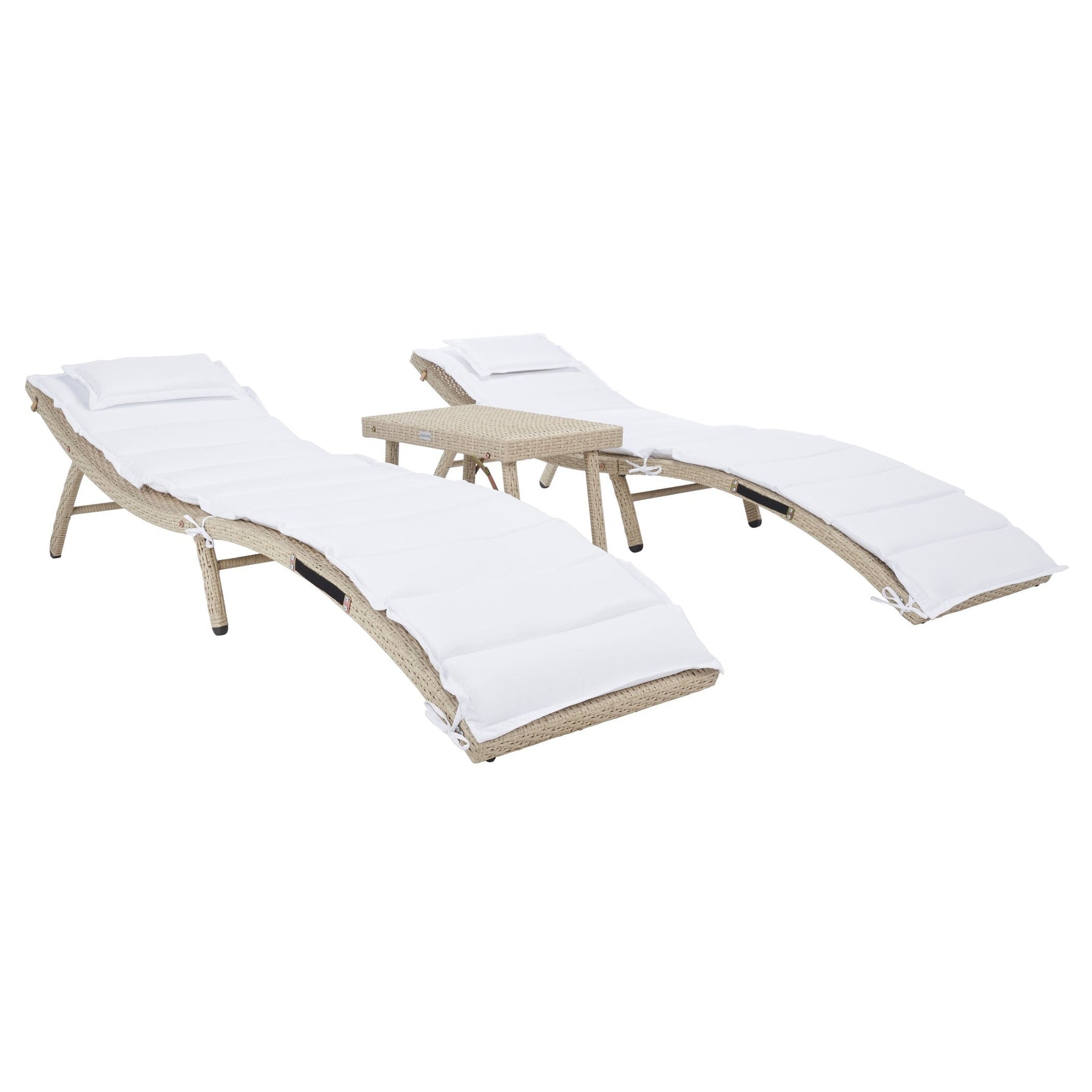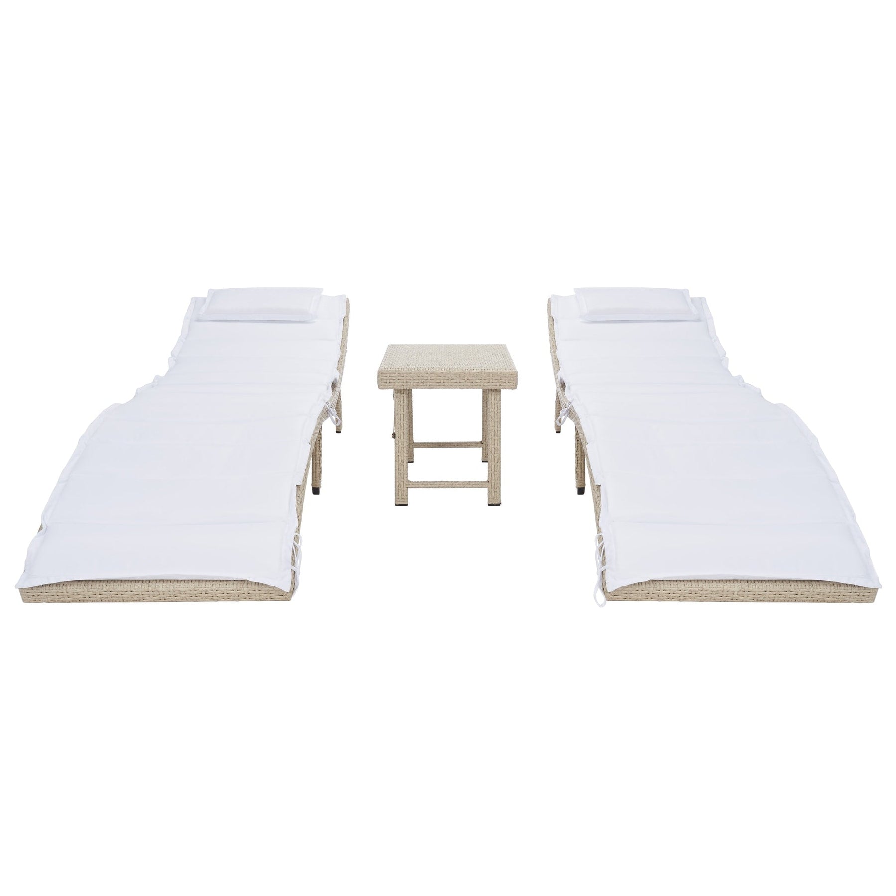Luxuriate in the summer sun with this 3 Piece Sunlounger Set. The softly flowing elongated silhouettes of Carew's two PE rattan seats are perfectly topped with plush white cushions for maximum relaxation, and a matching end table is ideal for colorful drinks or fresh fruits.