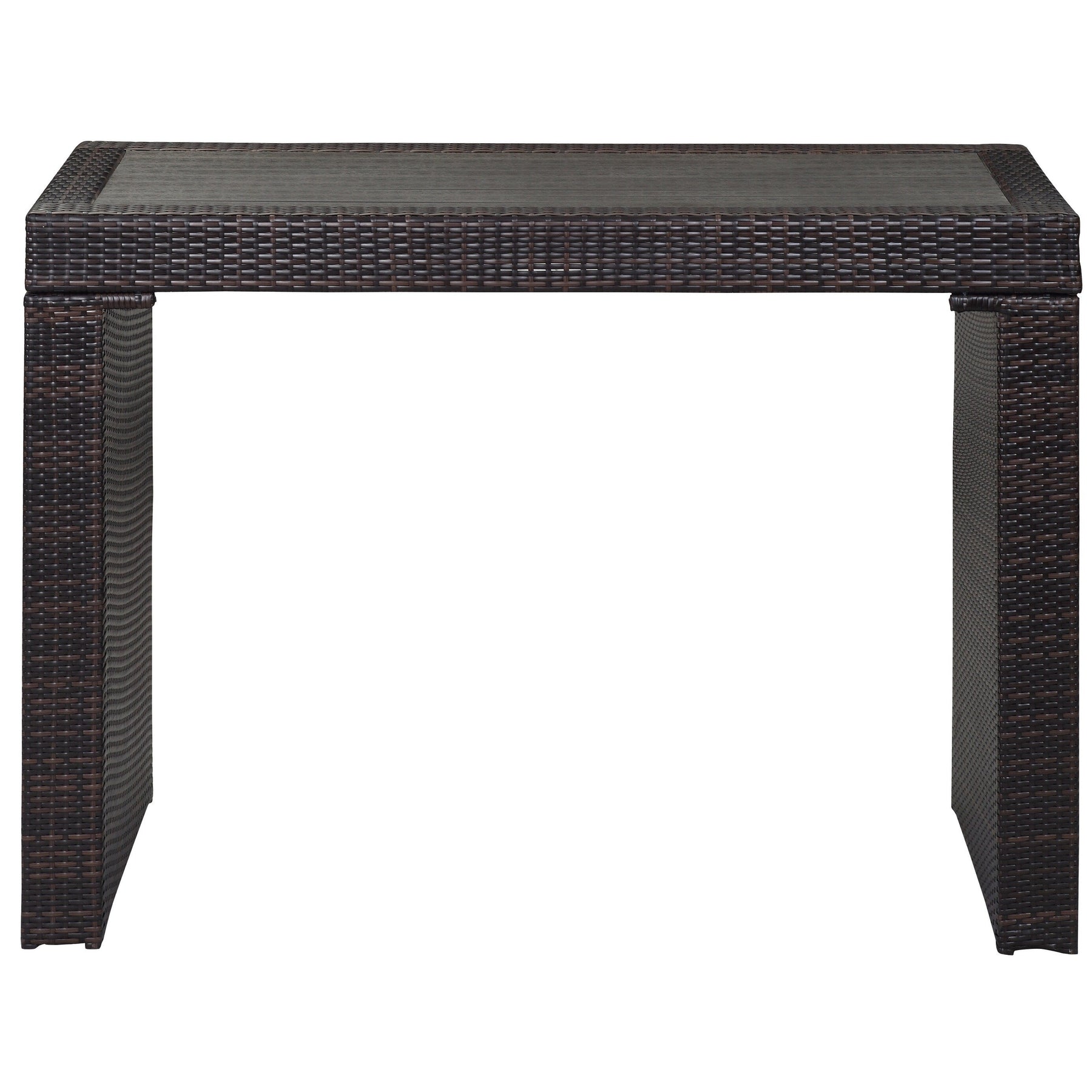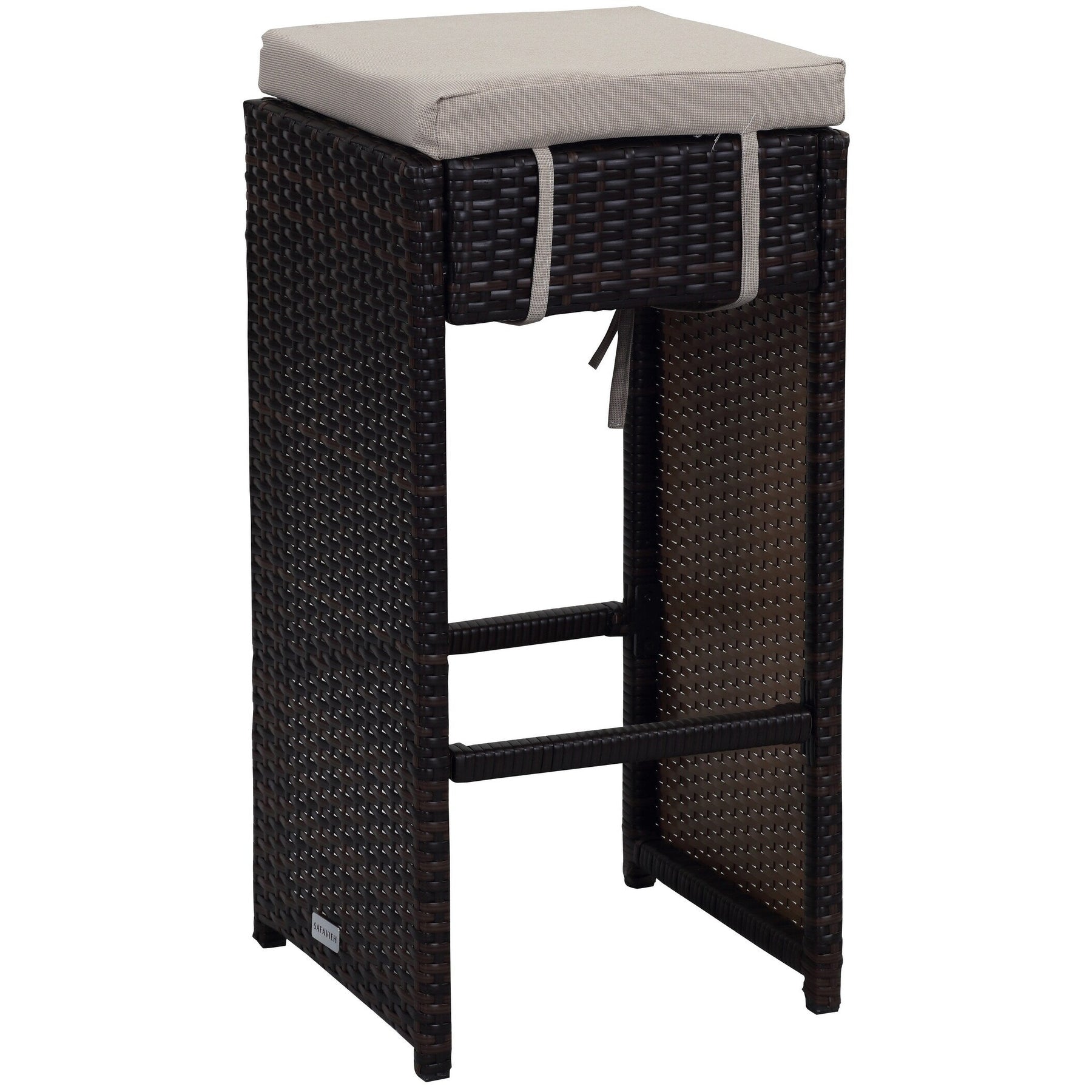 Architectural lines create a beautiful but hardworking outdoor bar set with six stools and a Parson's style table for happy hour or meals. Crafted of all weather PE woven rattan in grey with tie back cushions in sand, this set is truly easy care.