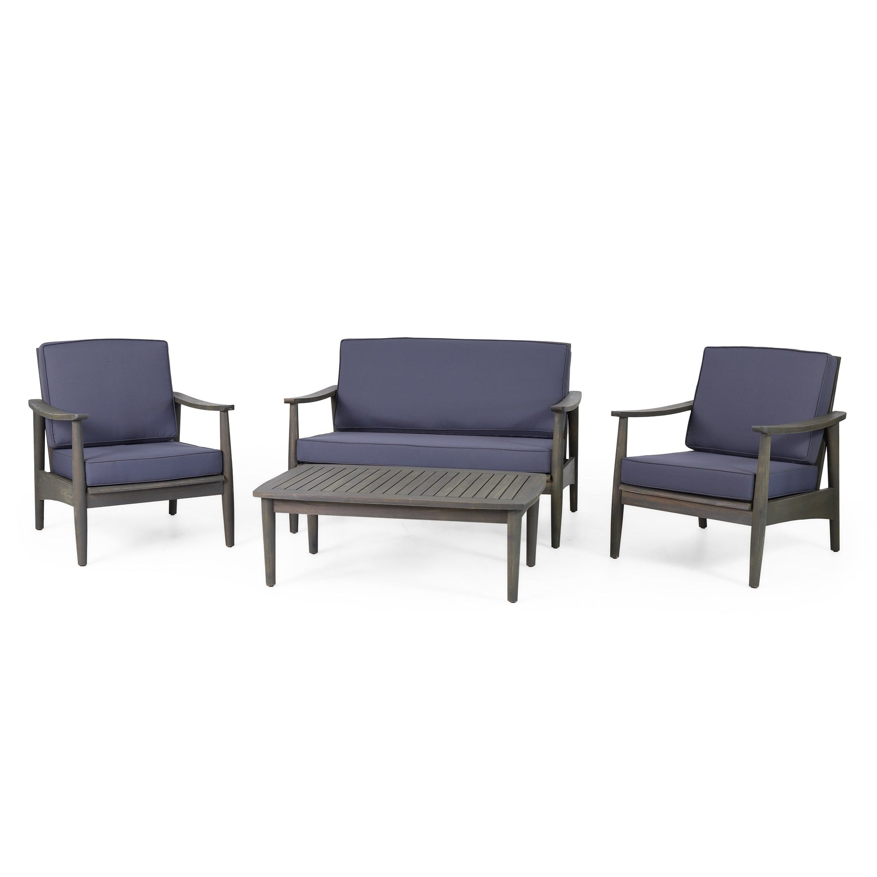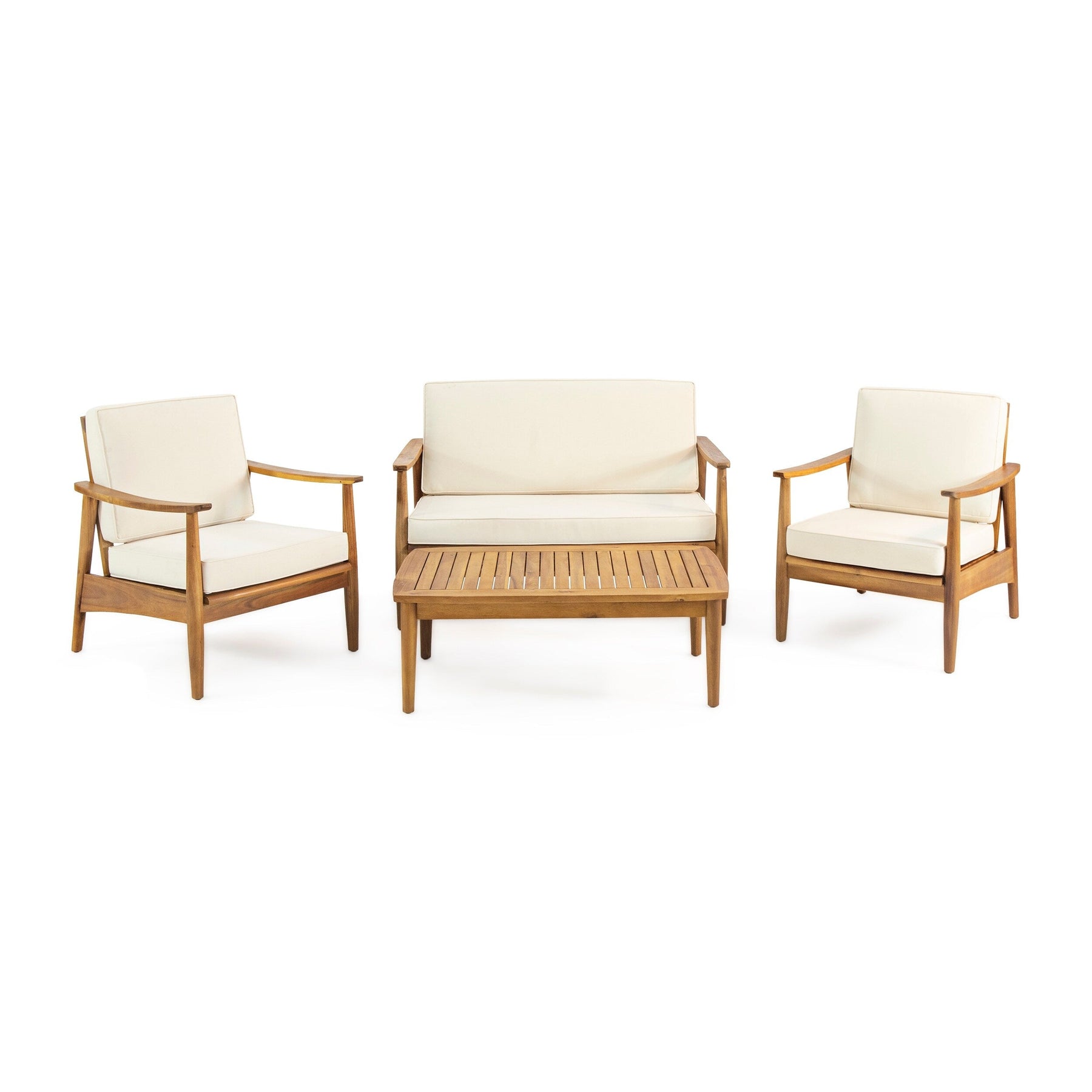 Update your outdoor patio area with this 4-seater chat set from Willowbrook. With lovely acacia wood frames and classic slat paneling, this set highlights both assuring durability and incredible style for all to enjoy. The plush cushions help provide long-lasting comfort, so you can spend all day outside under the warm summer sun.
