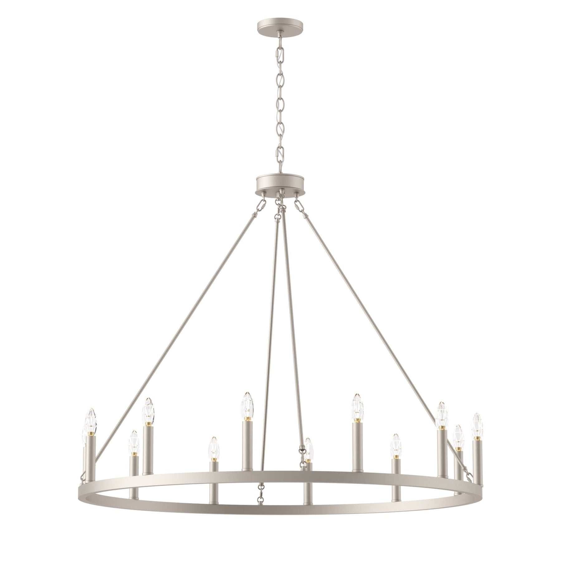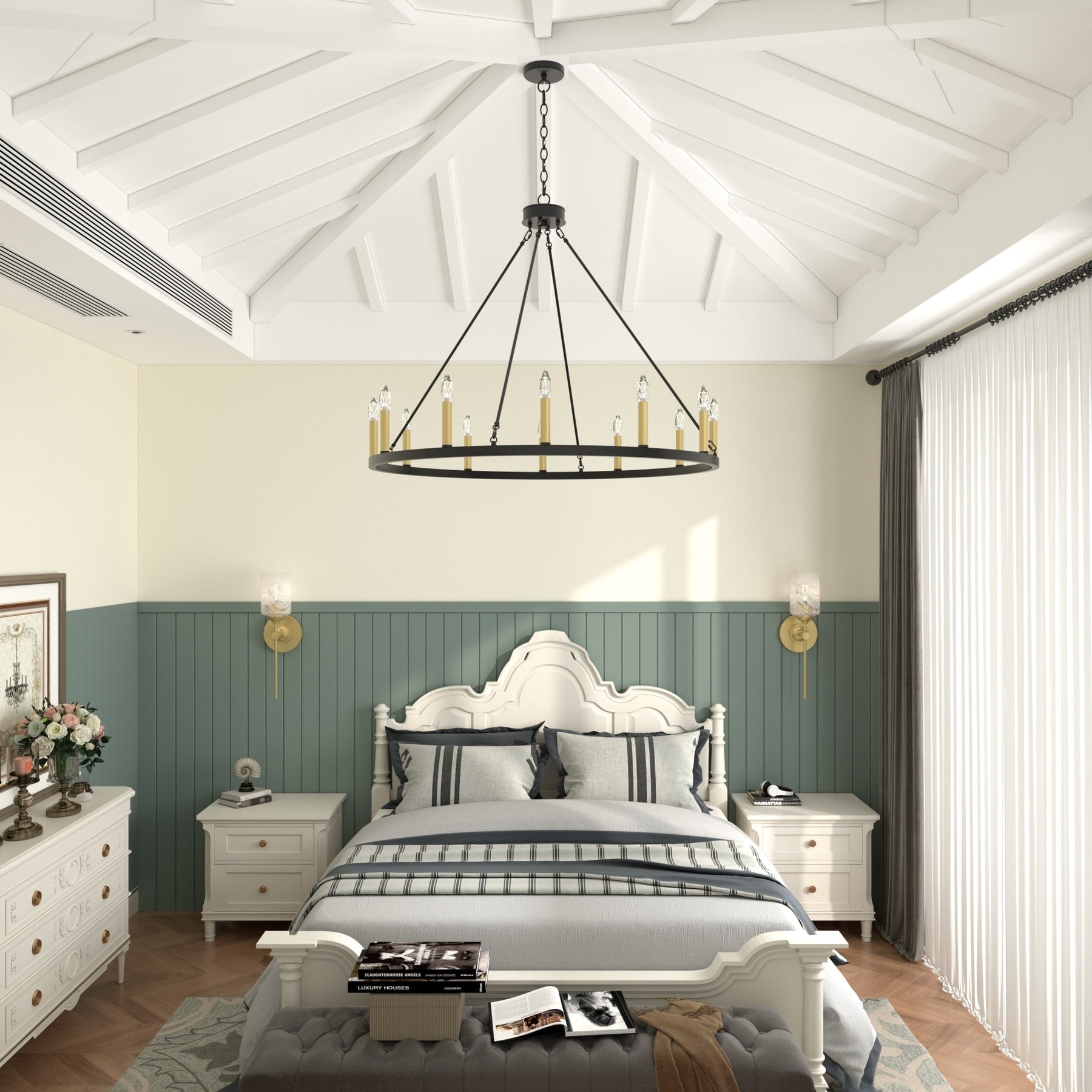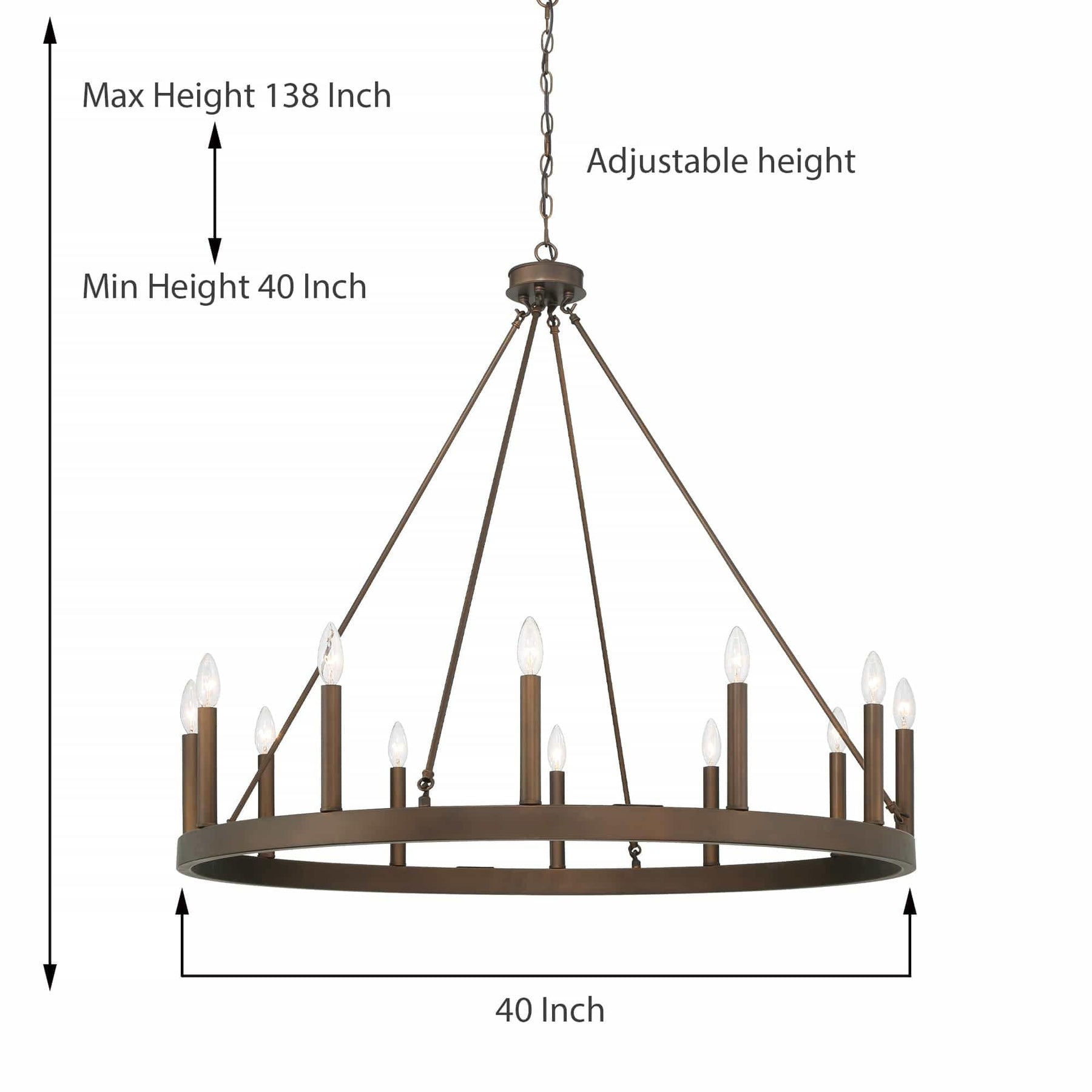 Add a touch of modern farmhouse style to your home with the Wagon Wheel Chandelier. Crafted of premium steel and finished in various color  for fitting various style like modern farmhouse, french country, and coastal.  With a large size in 40'', this candle chandelier is perfect for living rooms, foyers, staircases, hallways, dining rooms, and bedrooms. Comes with 96'' long chain, the modern farmhouse chandelier height is adjustable from 40' to 138', ideal for normal and high ceiling, and sloped ceiling also compatible as that gives you versatile options for placement.  With 12 candle-style holders (candelabra bulbs sold separately) are exposed, so they can give off a boost of brightness and light.
