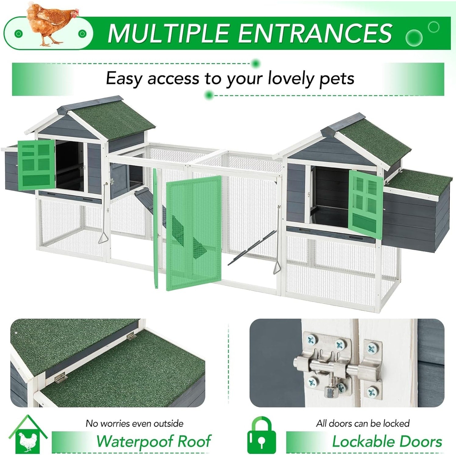 • Convenient Handle & Lockable Design -- Steel slide handles built to easily control the door between the run and resting room and keeps pets safe at night. A series of locks on each access point ensures the safety of pets.