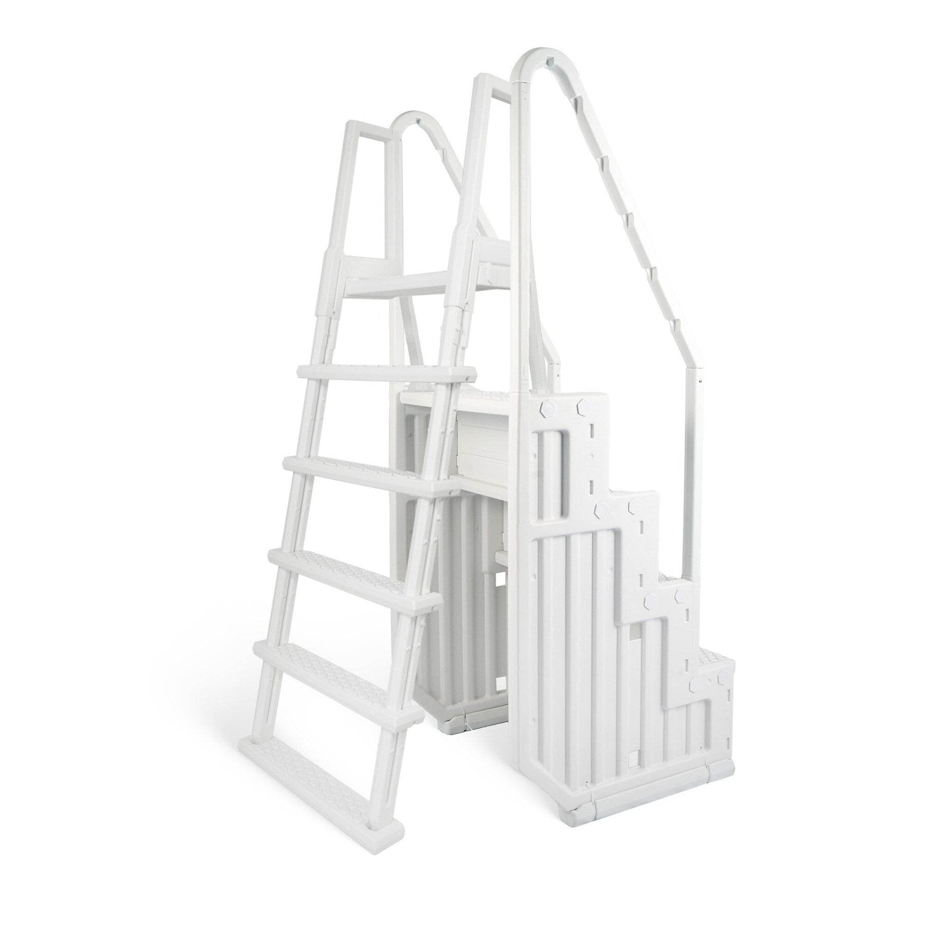 • STABLE AND STURDY CONSTRUCTION - Featuring double handrails and extra-wide, slip-resistant steps, this step and ladder system provides sturdy support for swimmers entering or exiting the pool. The added stability of the outside ladder with a platform ensures that the system remains firm and reliable. This design reduces the risk of slips and falls, making pool access safer for everyone.