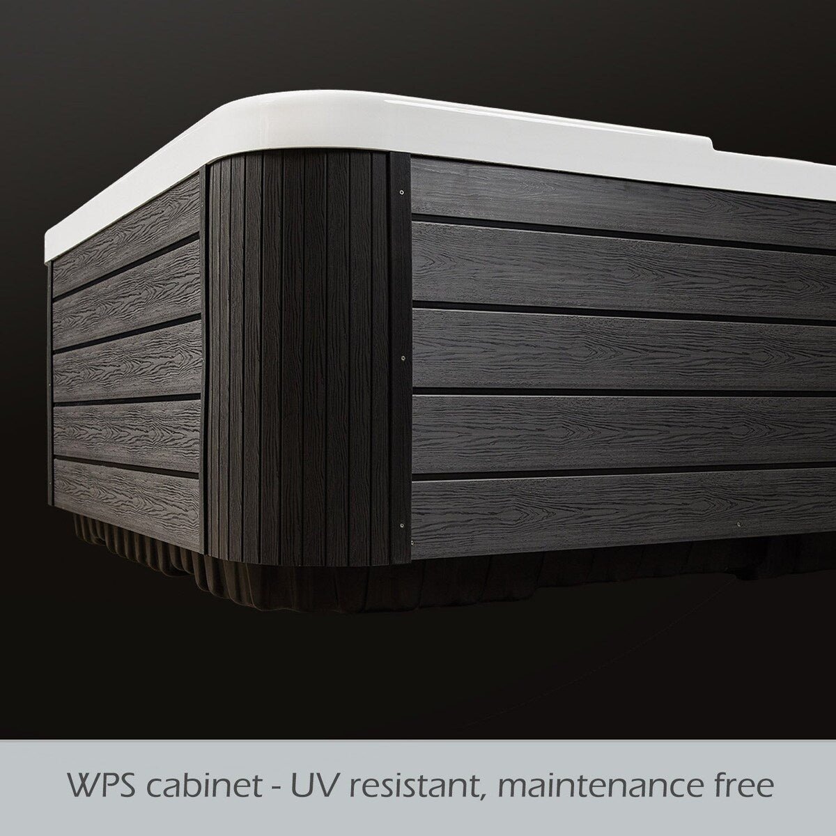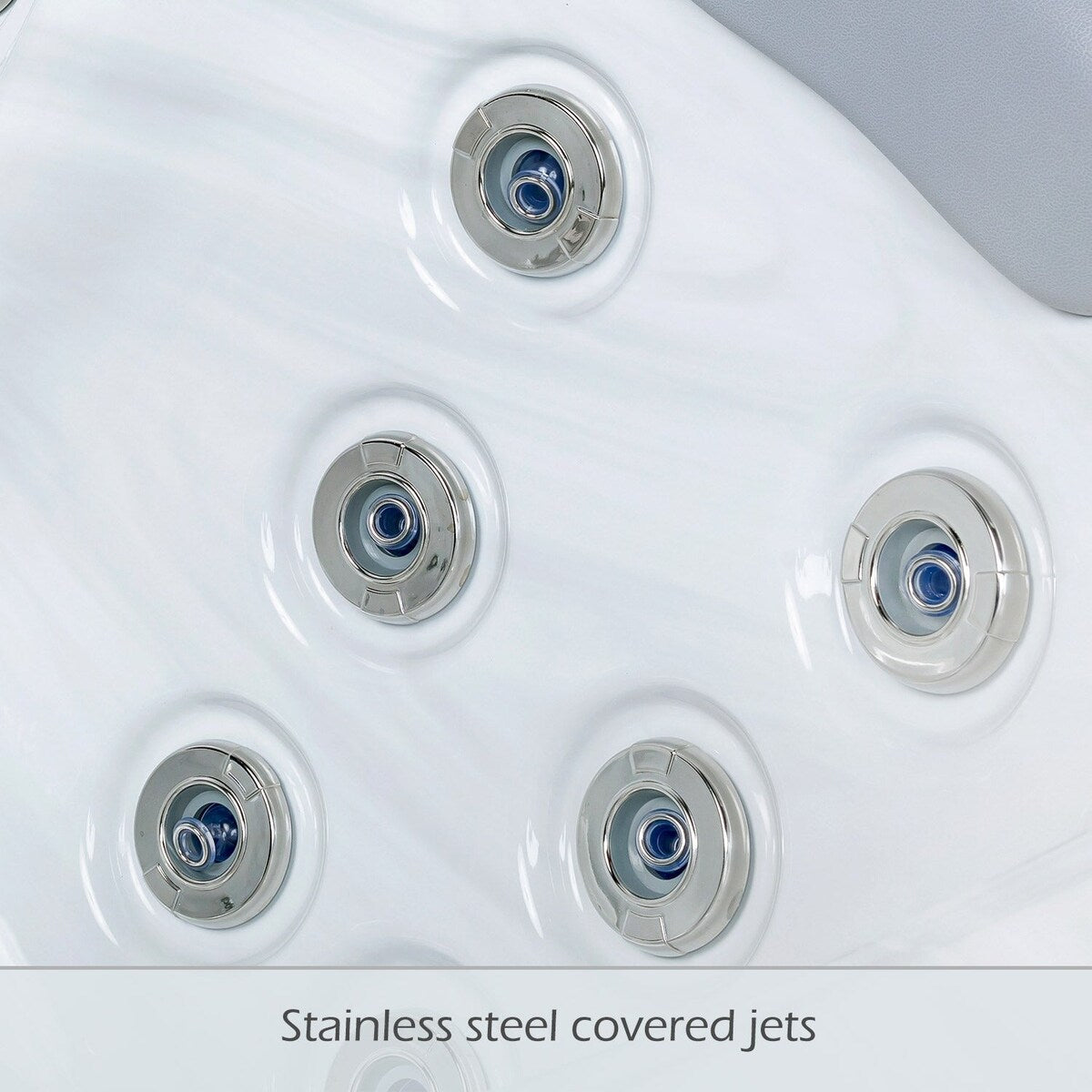 Experience the ultimate in relaxation with the Buenospa Jersey 6-Person Hot Tub. With ergonomically designed seats and 46 massage jets, including neck and shoulder massage, everyone will have their favorite spot. The Jersey adapts to your individual needs with 5 standard seats and 1 lounge seat, all in a model with low space requirements. The soft, modernistic design complements the Sterling Silver frame and Gray cabinet color, while unique waterline lighting and ozone water sanitization provide mental and physical relaxation.