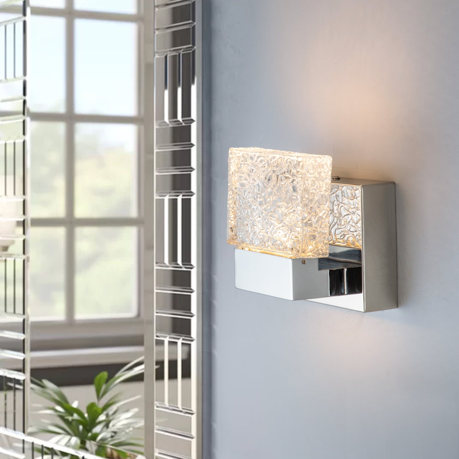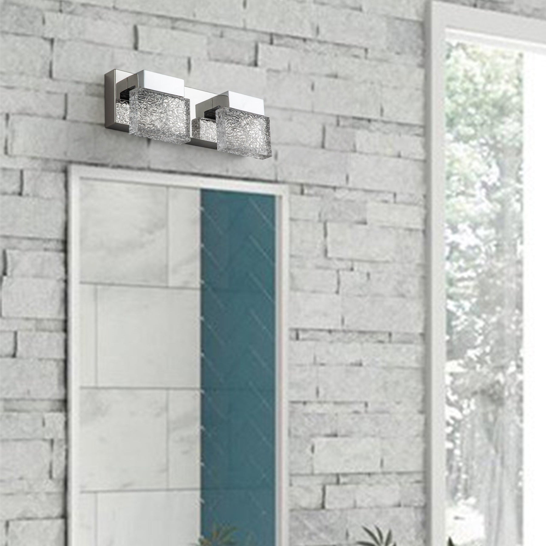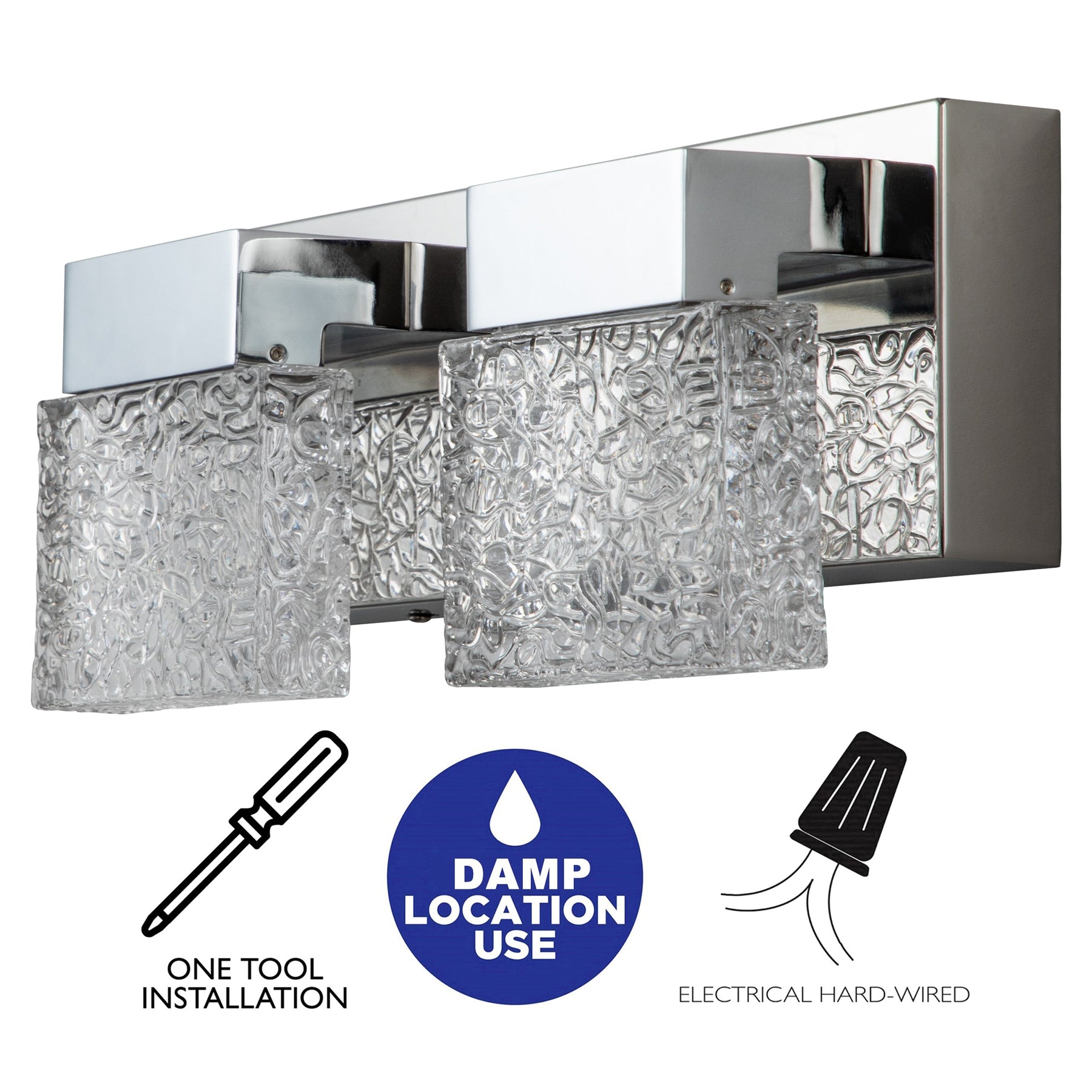 Upgrade your bathroom with the sleek and energy-saving Stainless Steel LED Vanity Light with Art Glass Shades in Chrome. The clear ice-like brick-art glass shades give a contemporary touch that will complement any décor style. Made with durable stainless steel and integrated LED modules in an acrylic diffuser, this maintenance-free fixture is perfect for your bath area.