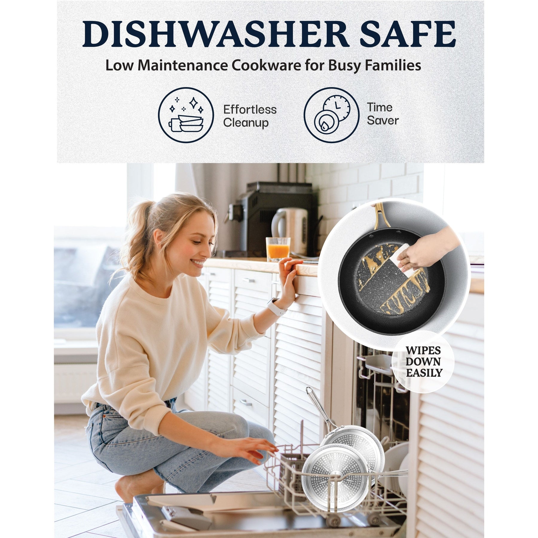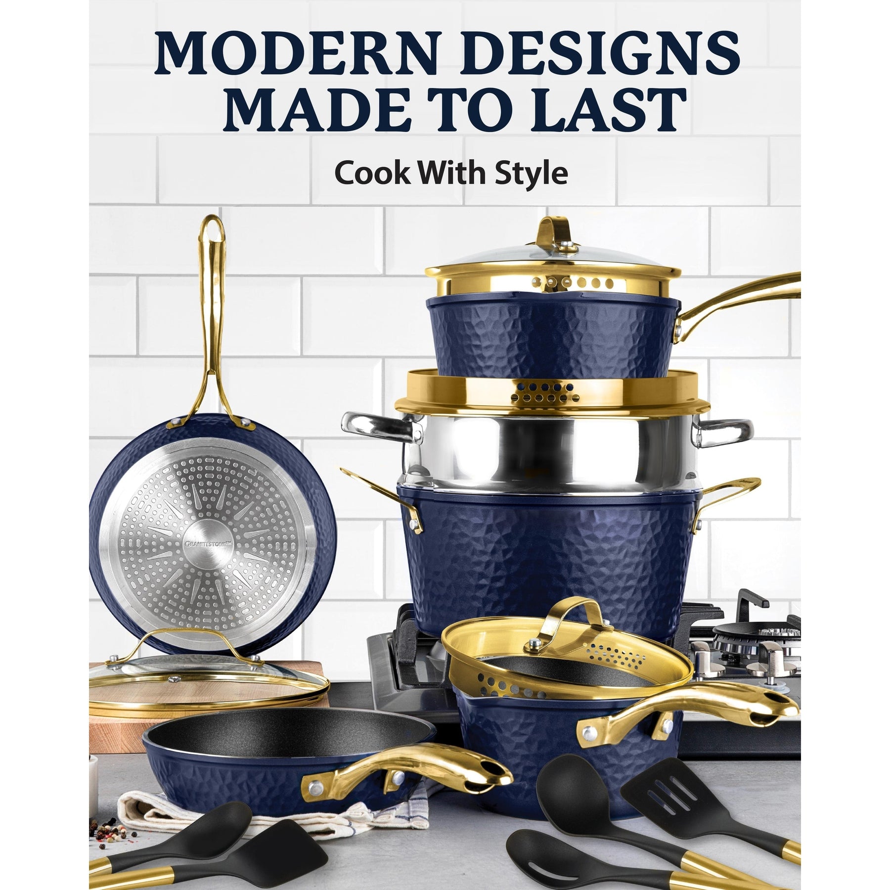 Reimagine weeknight dinners with the 10x longer lasting and ultra durable Granitestone Charleston cookware set. The 15-piece set includes a 8' fry pan, 10' fry pan with lid, 1.5-quart saucepan with lid, 2.5-quart saucepan with lid, 5-quart stock pot with lid, stainless steel steamer basket, and 5-piece utensil set. Crafted with three layers of exceptional durability with a coating that lasts 10x as long as conventional ones, this pot and pan set was made to handle your daily kitchen routines. Its nonstick surface ensures that food effortlessly glides off, while remaining easy to clean. Little to no oil or butter is needed and every piece is made without PFOA, PFOS, lead, or cadmium so they're crafted for healthier cooking goals. A dishwasher safe design that's metal-utensil safe and scratch-resistant makes cooking and cleaning a whole lot easier. Each piece has an induction base and is oven safe up to 500˚F so you can cook any way you want. Gold ergonomic handles stay cool to the touch to offer maximum comfort while cooking. To top it off, it has a modern farmhouse look with a hammered design that brings elegance and durability together.