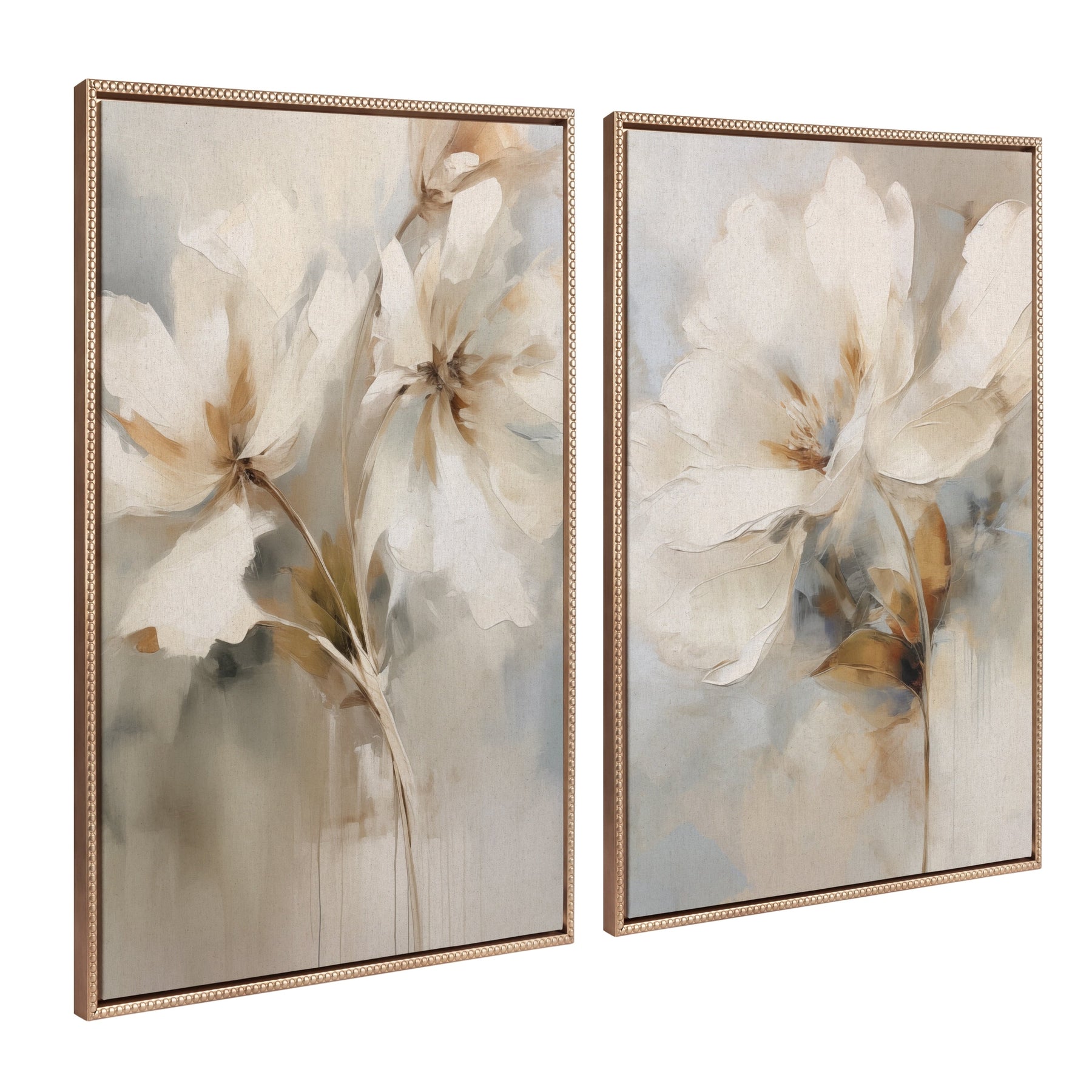 Elevate your wall decor with this exquisite vintage art set, featuring two pieces of abstract botanical floral linen paintings. The delicate beaded details along the frames add a touch of elegance to any space, while the simple floral designs bring a sense of tranquility and beauty to your home. Framed in the USA in Waunakee, Wisconsin, this traditional floating canvas art set of 2 is sure to bring joy to your space. Featuring our charming beaded frame, this art piece can fully embrace the vintage décor scheme without overwhelming the artwork or the rest of your home decor. This antique look is great for someone seeking a unique frame style to elevate their living room décor or their bedroom décor aesthetic. Our design team curates art that will fit perfectly in any room of your home. We create living room art wall decor, bedroom art wall décor, home office art wall décor, kitchen art wall décor, bathroom wall art décor, nursery wall art décor, or anywhere you want to bring a little beauty and charm to your walls. Specializing in home décor, we are continually bringing timeless works of art for the traditional decorator as well as trend-forward pieces for that eclectic art lover. Our high-quality framed canvas art also makes excellent gifts for birthdays, holidays, or housewarming parties. Printed on gallery-wrapped canvas and framed with a simple gallery frame this wall art is easy to display on the wall and will match with any décor style. The outer dimension of each individual piece is 23 inches by 33 inches by 1.6 inches. Print Names: 'Abstract Botanical Floral Linen Painting 1 and 2'