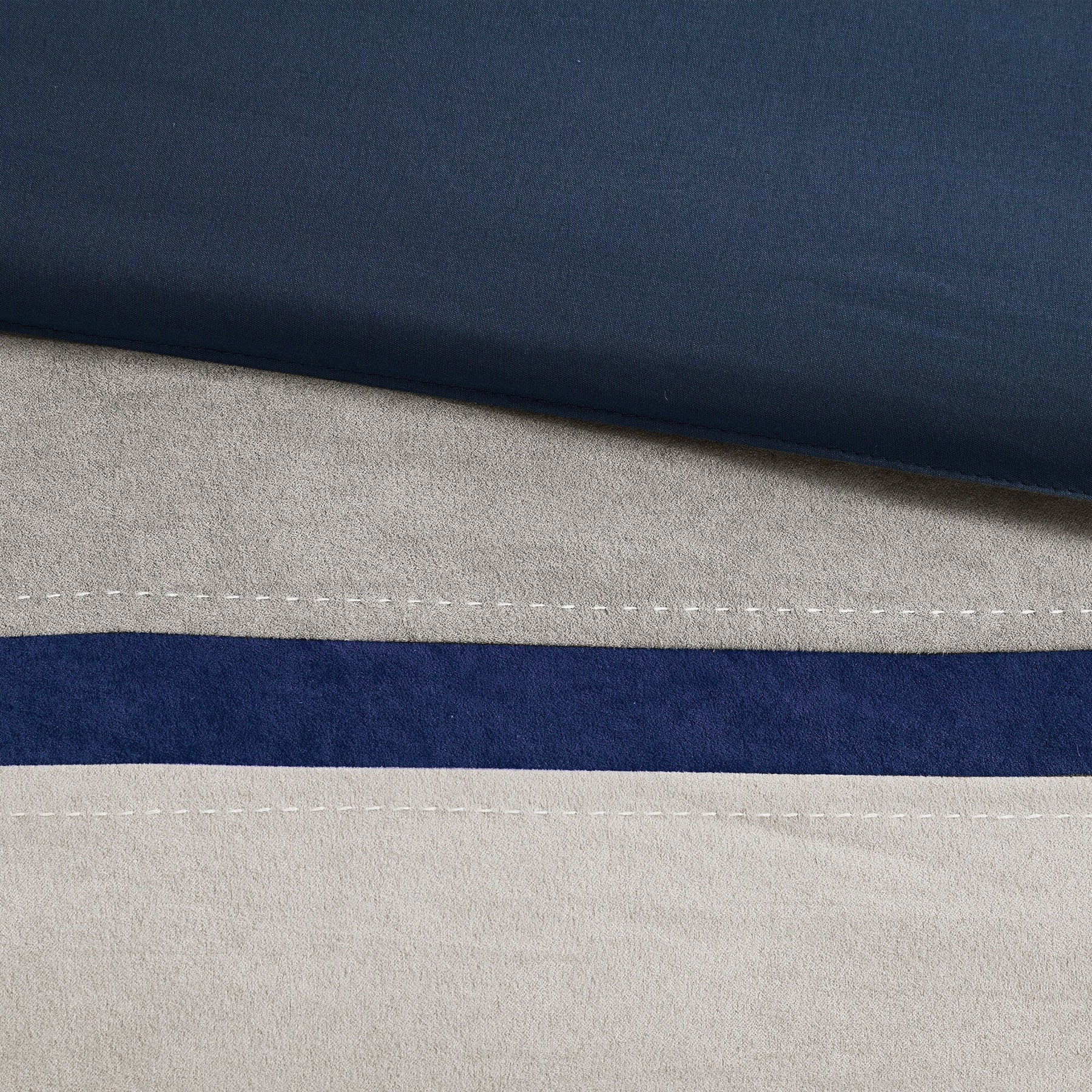 The Madison Park 7 Piece Hanover Comforter Set offers you a casual alternative in fashion bedding. The reverse of the comforter is solid Blue. The soft microsuede in heather grey, Blue and charcoal grey is pieced together to create this beautiful bed. The decorative pillows are embroidered and pieced to add a decorative element to this simple, yet beautiful bedding collection. With hypoallergenic filling in the comforter and pillows, this stylish comforter set easily refreshes your bedroom decor and is machine washable for easy care.