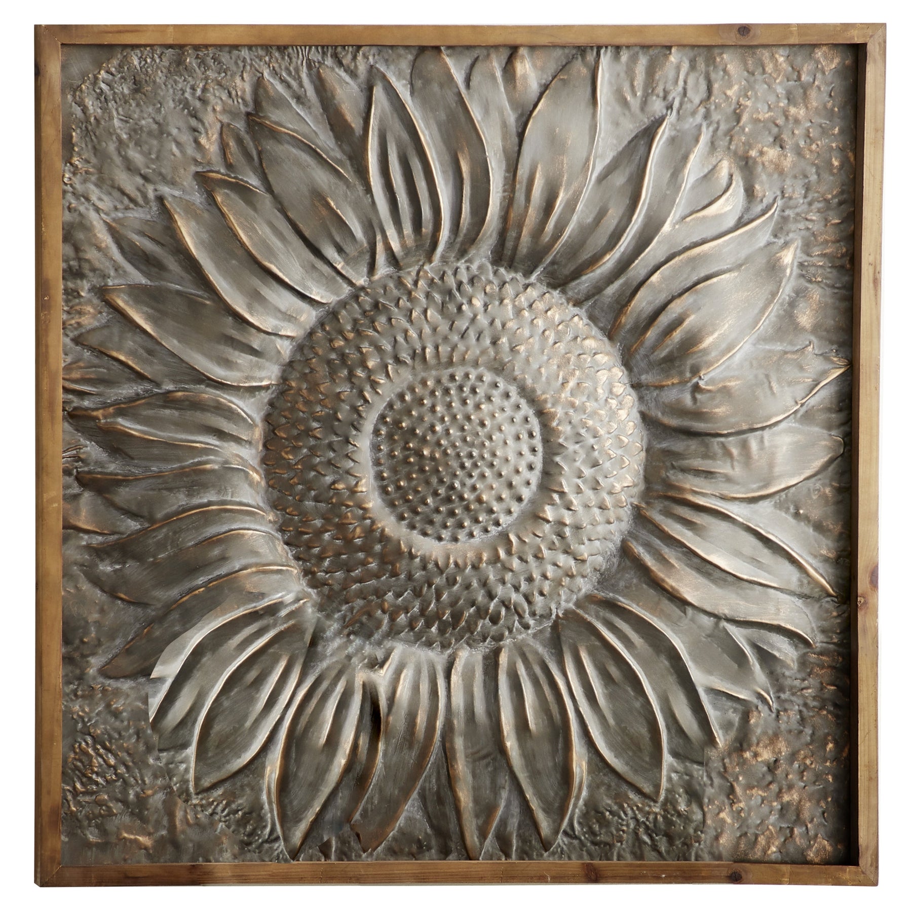 - Square decor for wall showcases a striking satin gray finish, with its dark silver metal sunflower highlighted by metallic gold brushstrokes and brown frame