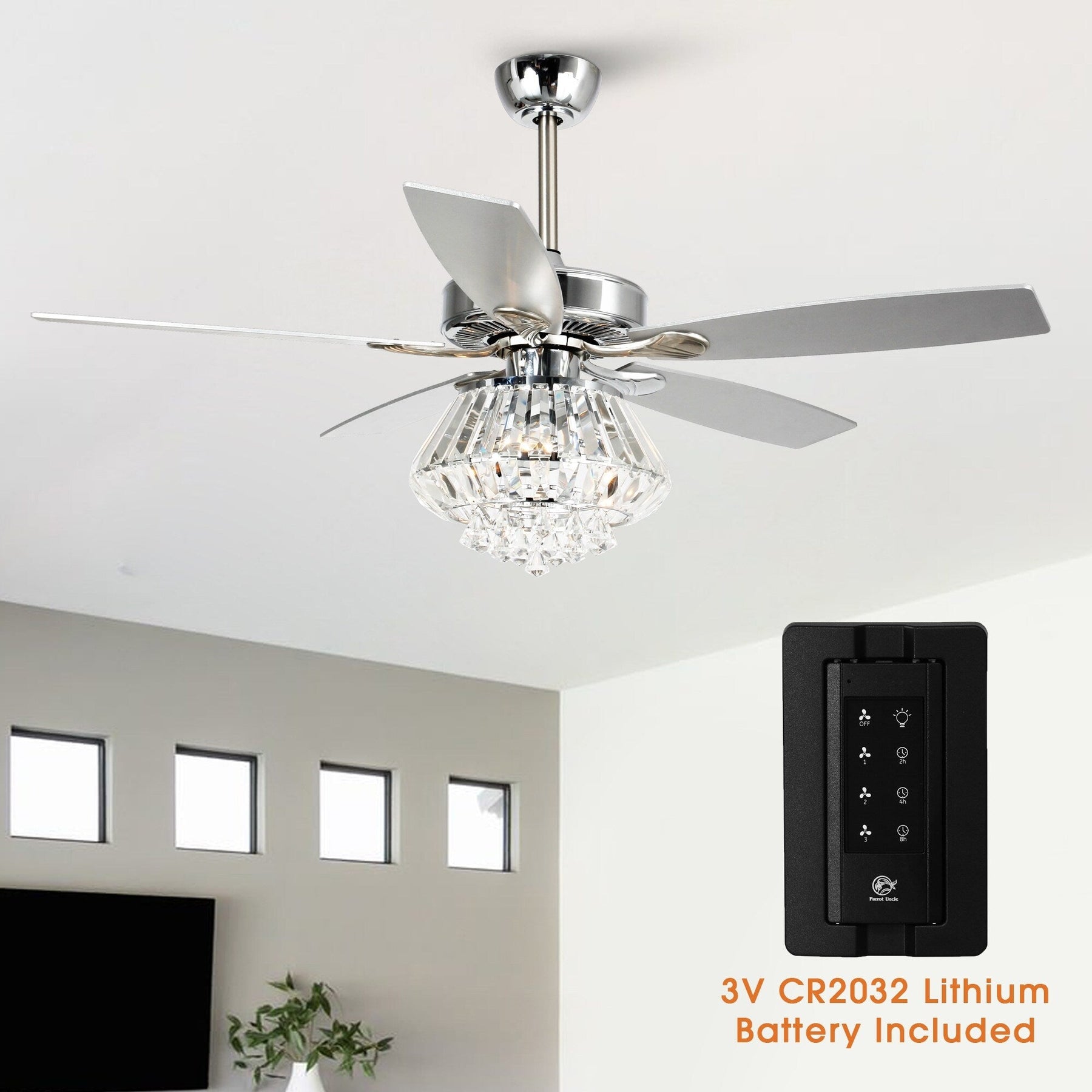 Stay cool with style with the Modern Chrome 52-inch Crystal Chandelier Ceiling Fan with Remote from Parrot Uncle. This cost-efficient yet elegant ceiling fan serves both your cooling and lighting needs, featuring a full glass crystal shade that sparkles and catches the light. The silvertone-stained wood blades move an impressive amount of air, making it the perfect addition to any room. The included handheld remote control makes it easy to operate the 3-speed AC motor and change the speeds, while the timer function allows you to set it for 2, 4, or 8 hours. Perfect for sloped ceilings up to 15 degrees.