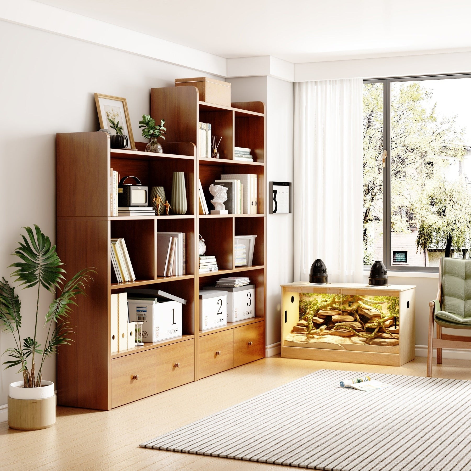 Material: Constructed with particleboard (PB) and glass, our terrarium merges durability with modern aesthetics.