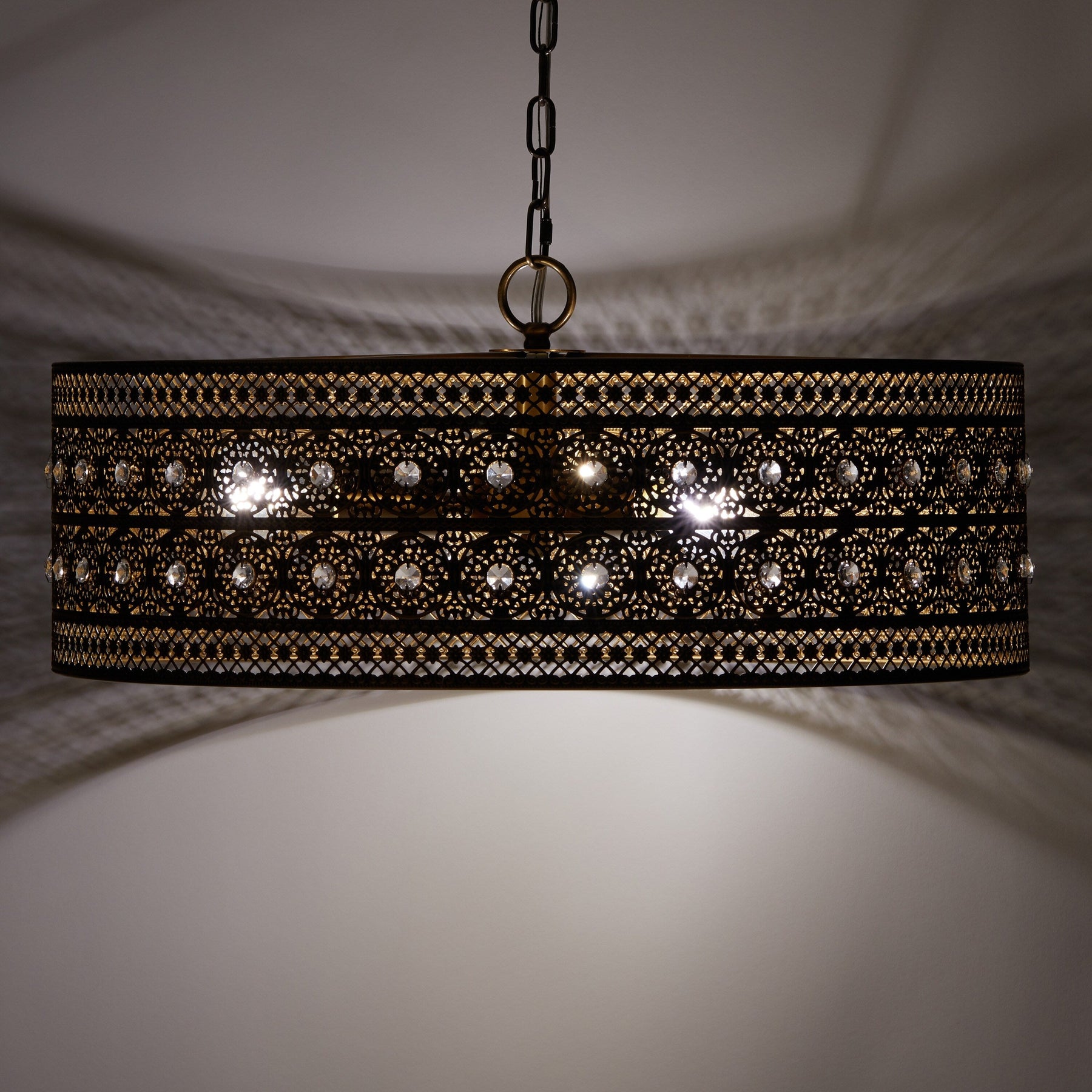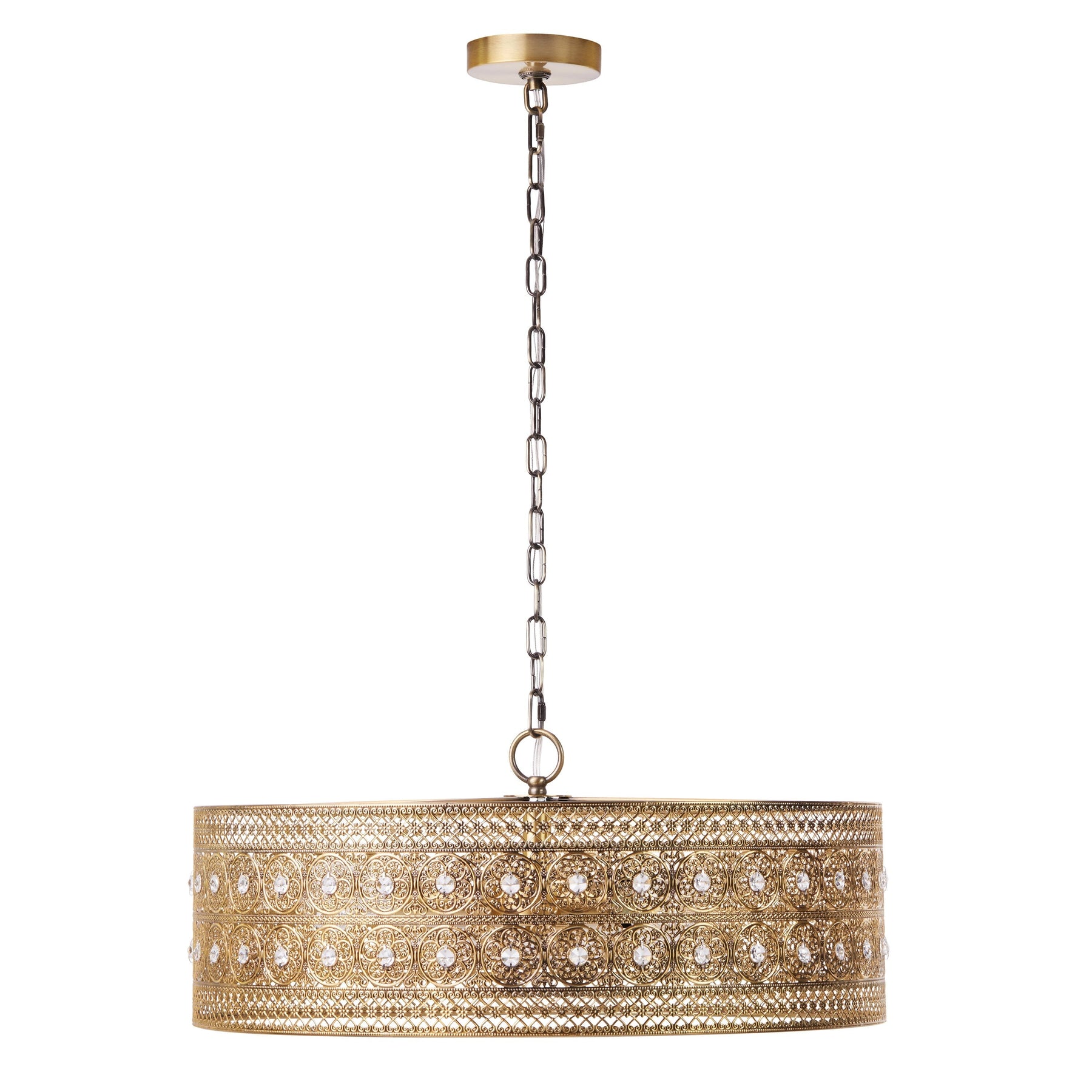 Bring the perfect balance of glam and tradition to your space with the River of Goods Bryar Brass and Crystal 23.5'W 3-Light Chandelier. With an oversized brushed brass finish, this chandelier features a double-layered medallion patterned shade and 70 faceted clear K-9 crystal jewels. Perfect for your dining room, living room, or foyer, this luxurious piece will make a bold statement in any room.