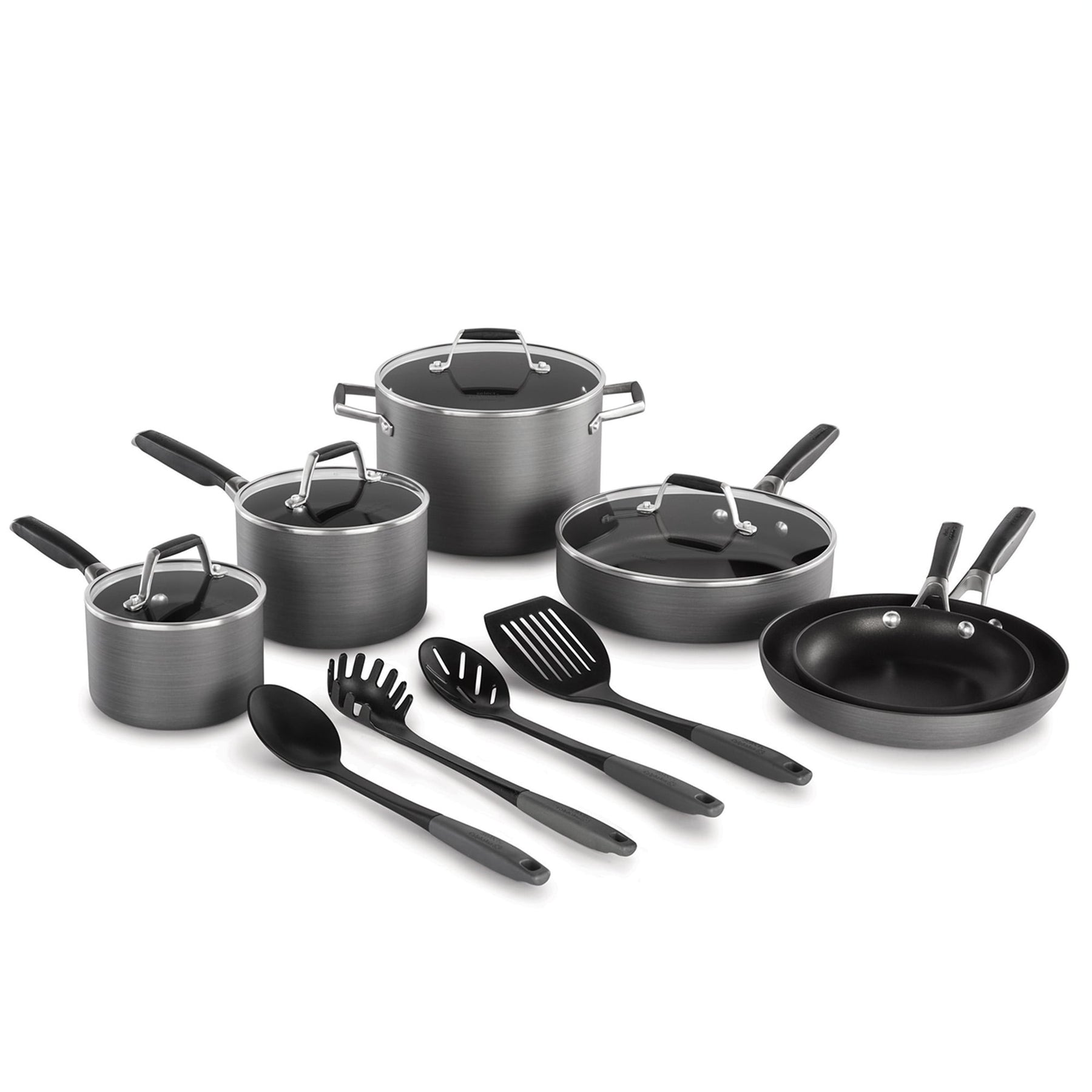 An essential addition to any kitchen, Select by Calphalon Hard-Anodized Nonstick Cookware helps you cook more smoothly thanks to its improved* easy-release surface. Featuring AquaShield nonstick technology, this cookware line performs like new 40% longer* for remarkable food release over and over again.・Water-based AquaShield nonstick technology keeps pans performing like new 40% longer (vs. previous generation of Select by Calphalon)・Dishwasher-safe for easy cleanup・Long silicone handle stays cool on the stovetop・Oven-safe up to 400 degrees F, so you can easily go from stovetop to oven・Tempered glass lid・Set includes: 8-inch Frying Pan, 10-inch Frying Pan, 1.5-quart Sauce Pan with lid, 2.5-quart Sauce Pan with lid, 3-quart Saute Pan with lid, 6-quart Stock Pot with lid, Solid Spoon, Slotted Spoon, Pasta Fork, and Slotted Turner・Compatible with most stovetops, including gas, electric, and glass・Limited 10-year warranty