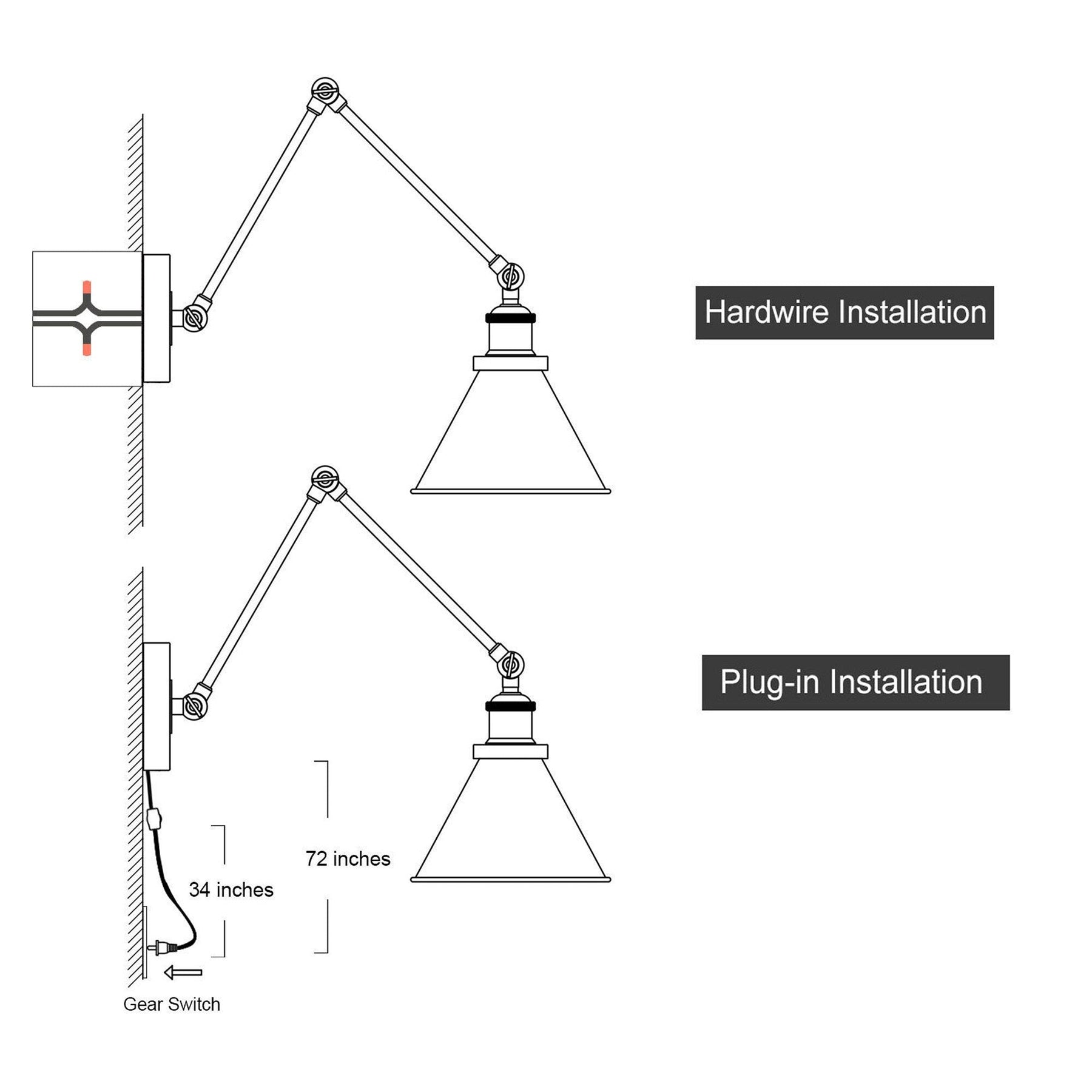 Add vintage sophistication to your living or bedroom space with this set of 2 Plug-in Adjustable Brushed Silver Swing Arm Light Wall Sconces. The antique silver finish and retro conical shaped shades with matte black fastening arms create a fashion-forward look. These top quality wall lamps can be easily mounted on the wall and directed to provide task lighting wherever you need it. Use them in hardwired or plug-in mode and adjust the arms to your liking.